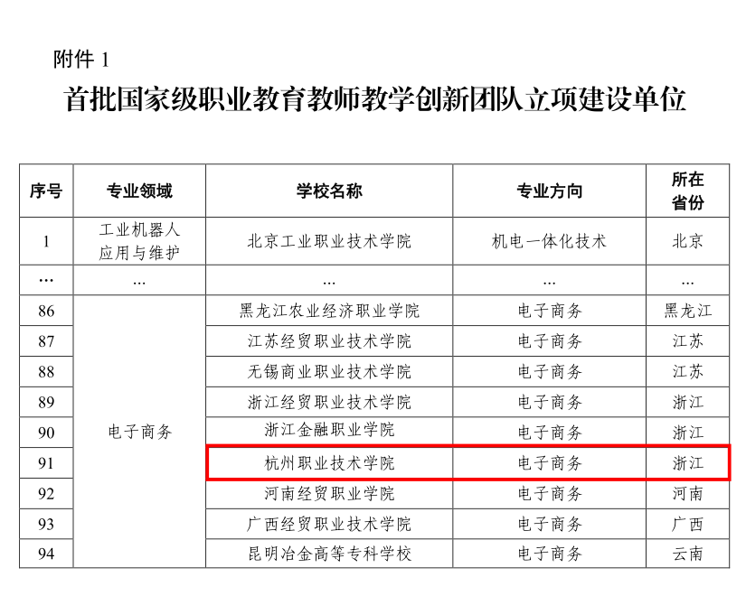此次确定的首批国家级职业教育教师教学创新团队立项建设单位共120个,国家级职业教育教师教学创新团队培育建设单位2个。其中浙江省共11所高职院校教学团队入选。全国电子商务专业领域仅有9所高职院校入选。