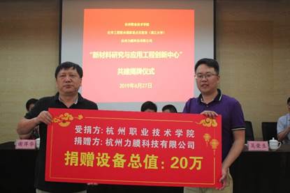 6月27日,杭州职业技术学院、化学工程联合国家重点实验室(浙江大学)、杭州力膜科技有限公司三方共建“新材料研究与应用工程创新中心”成立暨揭牌仪式在第六会议室隆重举行。