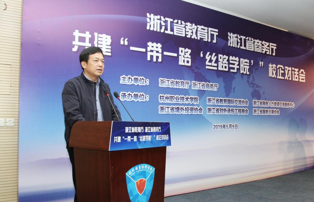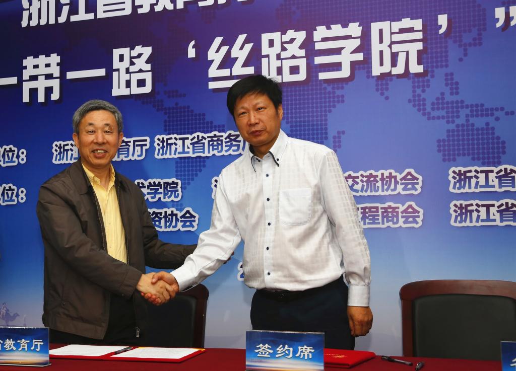 会上,省教育厅副厅长丁天乐、省商务厅副厅长胡潍康签署了《省教育厅 省商务厅合作共建“‘一带一路’丝路学院”谅解备忘录》,杭州职业技术学院与海兴电力股份有限公司、浙江经贸职业技术学院和浙江机电职业技术学院与华立集团签订了共建“丝路学院”意向书。温州职业技术学院、华立集团分别代表“走出去”学校和企业作交流发言。
