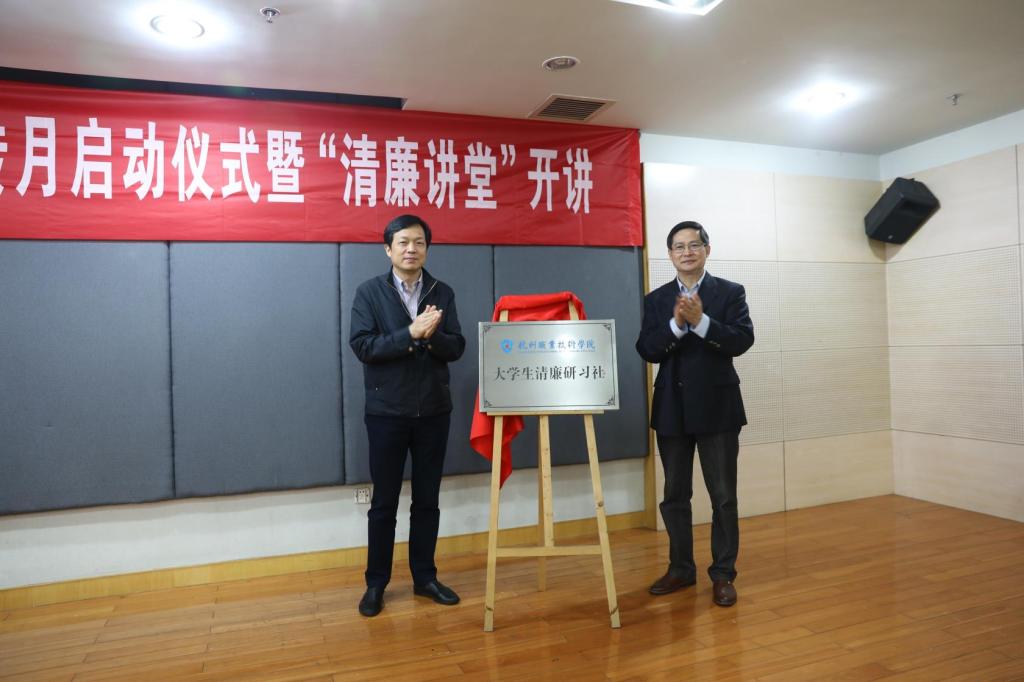 启动仪式上,举行了大学生清廉研习社和“清廉杭职”法纪宣讲团成立仪式。校党委书记金波和市纪委监委三室主任黄胜贤为杭州职业技术学院大学生清廉研习社成立揭牌,驻教育局纪检监察组赵清平组长和校党委副书记陈泉淼为“清廉杭职”法纪宣讲团成员颁发聘书。