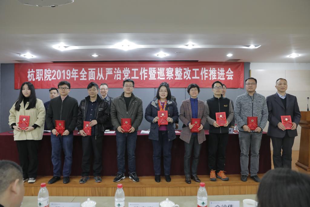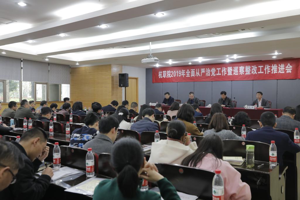 校党委书记金波出席会议并作重要讲话。他指出,本次会议是我校第二次党代会后召开的第一个全校性大会,意义重大,重点突出,任务具体。他从贯彻落实党的十九大精神、坚持党的全面领导、把握意识形态工作领导权、干部队伍和人才队伍建设、党风廉政建设等五个方面充分肯定了学校2018年全面从严治党工作取得的新成效,并分析了新一年学校落实全面从严治党面临的新形势新任务。他要求全校上下要提高政治站位,持续落实巡察整改,扎实推进学校全面从严治党向纵深发展。一是进一步提高思想认识。二是进一步聚焦重点难点问题。把政治建设放在首位,严肃党内政治生活,抓好基层党建工作,严格执行干部人事制度,严明纪律要求,认真履行好“两个责任”;三是进一步压实整改责任,在对标具体要求和整改落实上再发力,推动巡察整改工作往深里走,向实处落。他强调,要把“清廉杭职”建设融入人才培养、科学研究、社会服务、文化传承创新、国际交流合作等各个方面,为我校建设国内一流、国际上有较大影响力的“高职名校”提供坚强保障。
