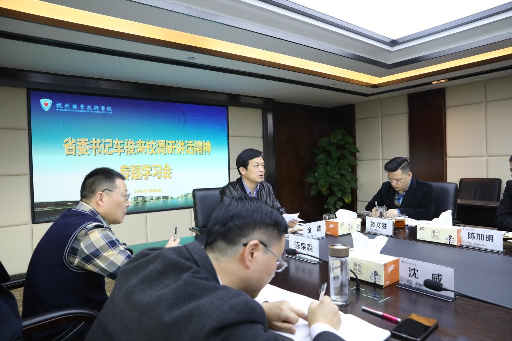 学习会上,党委书记金波传达了车俊来校调研以及在教育工作座谈会上的讲话精神,并就贯彻落实讲话精神提出五点要求:一是要深化学习宣贯,全校上下要把学习宣传贯彻车书记讲话精神,与即将召开的全省教育大会精神学习结合起来,做到学习好、贯彻好、落实好;二是要坚定发展信心,要保持发展定力,持续深化校企合作体制机制改革,不断完善提升“校企共同体”办学模式;三是要提高工作标准,要按照车书记对学校发展的新期望,拉高工作标杆,不断提升办学影响力;四是要坚持问题导向,要聚力推进重点和难点工作,建立长效机制,把“高职名校”建设基础打得更牢、夯得更实;五是要更加努力进取,要以召开学校第二次党代会为契机,统一思想,鼓舞士气,乘势而为,奋力前行,不断提升办学治校能力和人才培养质量,为浙江和杭州高质量发展做出新的更大的贡献。