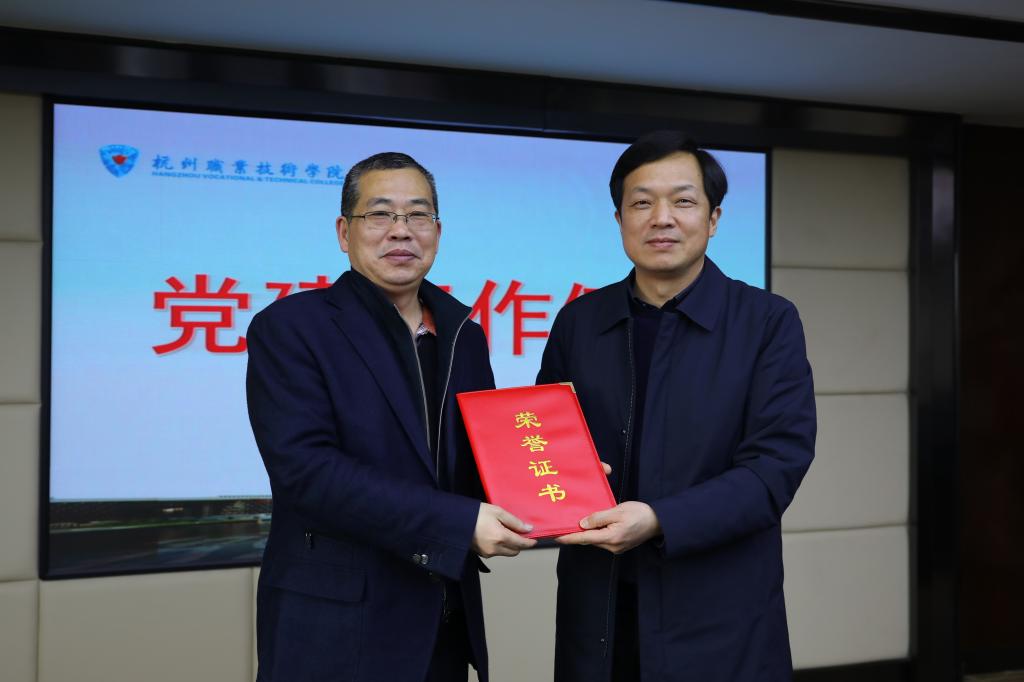 在全省高校首批党建“双百示范”评比中,我校特种设备学院直属党支部“党建助力精准扶贫 学生实现体面就业”项目入选党建特色品牌;商贸旅游学院、创业学院党总支“校企联动,创业领航”项目入选党建示范群。会上,金波为相关党组织负责人颁发证书。