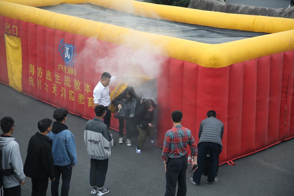 本次活动由四部分组成。第一部分是火场逃生屋体验,消防员们利用场景布置和散布烟雾,模拟出逼真的火灾现场。消防员向同学们详细讲解进入逃生屋的注意事项及火灾发生时的逃生自救知识,并组织同学们有序进入逃生屋。大家在狭小黑暗的空间里紧靠墙壁,相互搀扶,屈膝前进,感受在烟雾弥漫、光线黑暗的环境中逃生和疏散的过程。第二部分是消防器材展示,同学们不仅可以近距离接触消防车旁陈列的诸多消防安全器材,还可以亲身体验消防防护服等装备。第三部分是消防安全知识展览,活动现场布置了许多消防安全知识为主要内容的消防宣传教育展板,吸引到了广大师生驻足观看。第四部分是消防云梯登高、消防水带喷水体验,同学们或是三人一组依次体验登高梯,或是双手紧握水枪,体验消防水枪喷水,体验过后纷纷感叹消防员的辛苦。