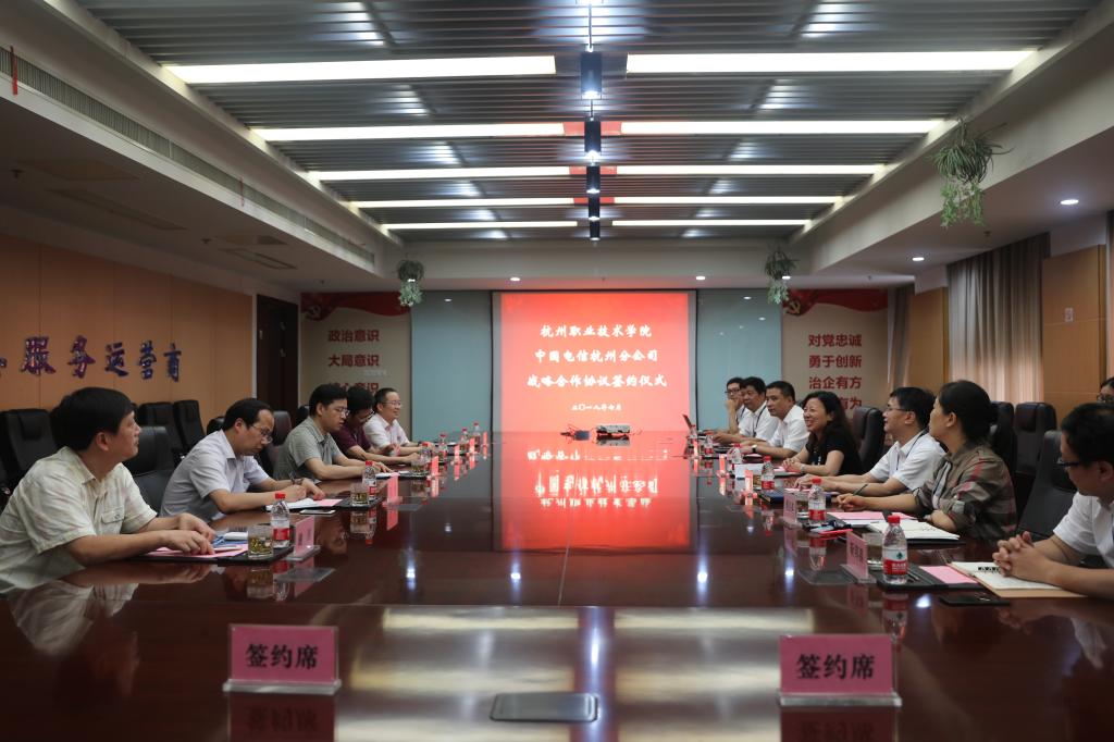 73日下午,杭职院与中国电信杭州分公司战略合作协议签约仪式在电信大厦31楼第六会议室隆重召开。我校校长贾文胜、副校长张洪宪以及党政办、宣传部、专业建设指导处、图信中心等相关负责人,杭州电信分公司总经理章晓钫、副总经理周臣武以及下沙分局、校园中心相关负责人共同出席会议。会议由杭州电信分公司校园中心经理傅卫英主持。