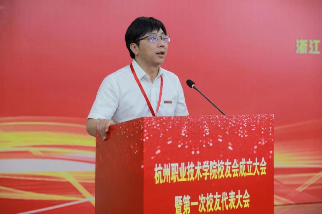 校友代表、国际贸易专业99届毕业生、杭州职业技术学院教育发展基金会理事,金日汽车零部件有限公司、百川联合汽配贸易平台董事长唐晓洪先生发言。他说,“人生最惜同窗日,白首难忘共读时”。在母校学习期间得到学校领导、老师的谆谆教诲和悉心关爱,多年来一直激励着自己不断前行,给予了他勇攀高峰的勇气和底气。唐晓洪倡议全体校友尽己所能,相互扶持,携手并进,不断壮大校友会规模,努力实现母校事业发展与校友会建设的共赢。