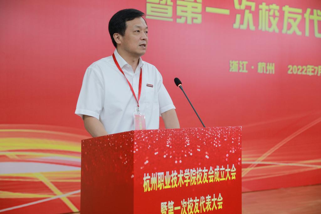 党委书记金波为会议致辞。他首先代表杭职院万余名师生员工向参加成立大会的各位领导、嘉宾以及线上、线下参会的校友们致以最崇高的敬意和最衷心的感谢,向校友会的成立和本次会议的召开表示热烈祝贺。金波指出,回顾学校建校以来的发展历程,杭职院从鲜为人知、夹缝中求生存的弱校,发展为跻身高职院校国家第一梯队行列的“双高校”,学校的发展一步一个新脚印、一步一个新台阶,实现了“跨越发展、华丽蝶变”,这离不开全体校友的共同奉献和大力支持,校友为母校赢得了广泛的社会影响和美誉,是母校不能忘怀的薪火传人。金波要求校友会要进一步加强平台建设,组织建设,加强对校友的跟踪和宣传,努力为学校发展献计献策。