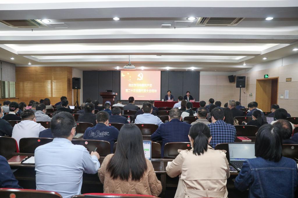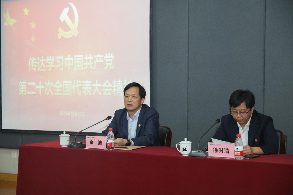 10月25日下午,杭州职业技术学院召开全校领导干部会议,第一时间传达学习中国共产党第二十次全国代表大会精神,传达学习省市干部会议精神和工作要求,对全校学习宣传贯彻党的二十大精神进行部署。校党委书记金波传达,校长徐时清主持,学校领导班子成员陈泉淼、高云飞、金徐伟、楼晓春、程利群、麻朝晖以及全体中层干部参加会议。