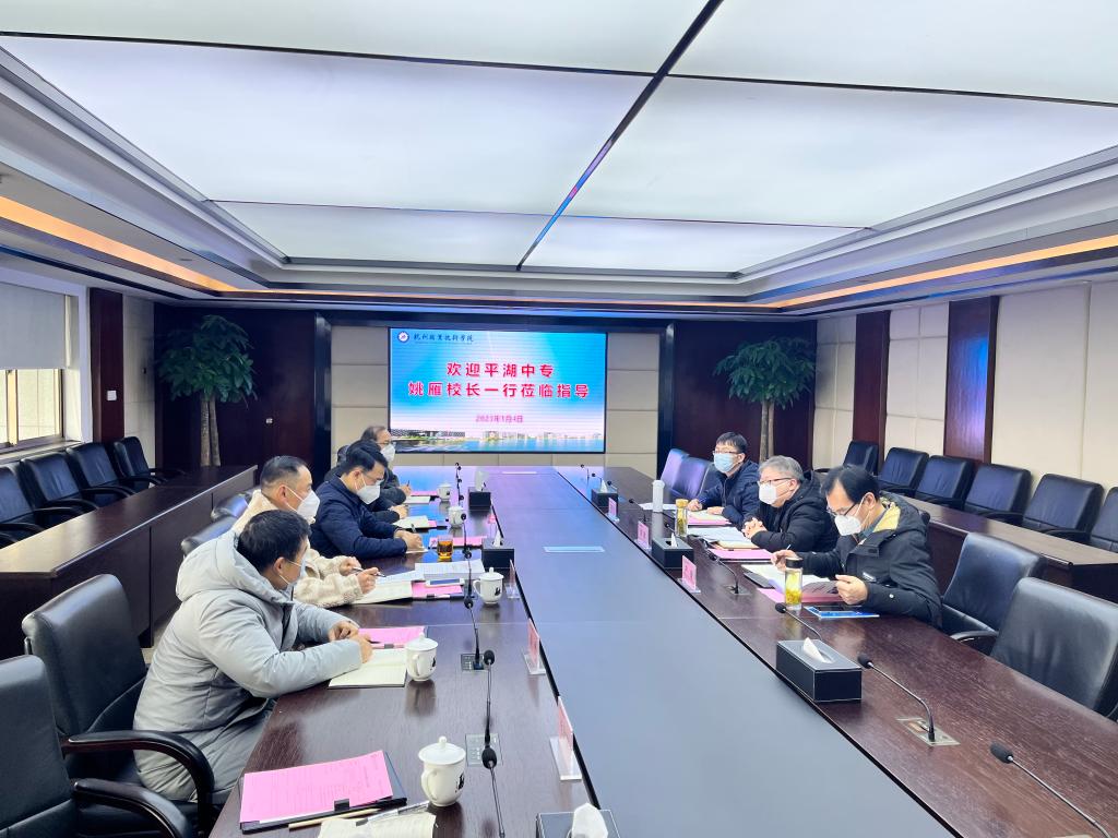 楼晓春代表学校欢迎平湖中专来访,平湖中专在3+2中高职一体化和“独山港产业学院”与我校有深入合作,楼晓春指出,要充分利用产业学院的三方优势,争取政府部门支持力度,把杭职院的优势特色融入产业学院发展,服务当地企业和社会发展。