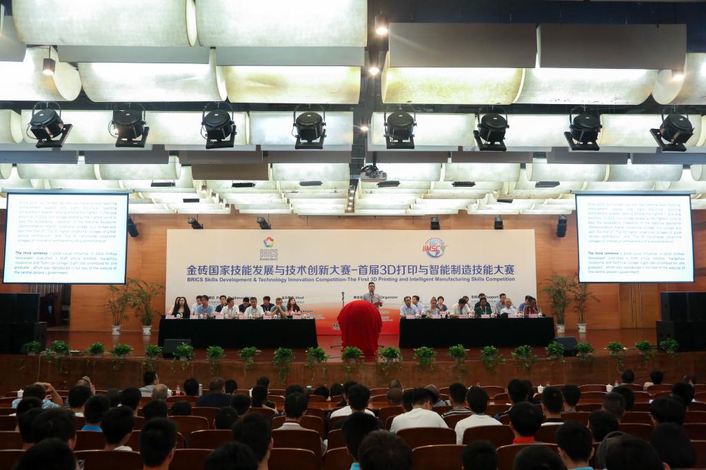由教育部、工信部指导,金砖国家工商理事会主办,金砖国家工商理事会技能发展工作组、北京企学研教育科技研究院、杭州职业技术学院、杭州市公共实训基地、武汉华中数控股份有限公司、广州中望龙腾软件股份有限公司、北京太尔时代科技有限公司、北京三维天下科技股份有限公司、北京嘉克新兴科技有限公司联合承办的金砖国家技能发展与技术创新大赛—首届3D打印与智能制造技能大赛总决赛于8月24日在我校隆重开幕。