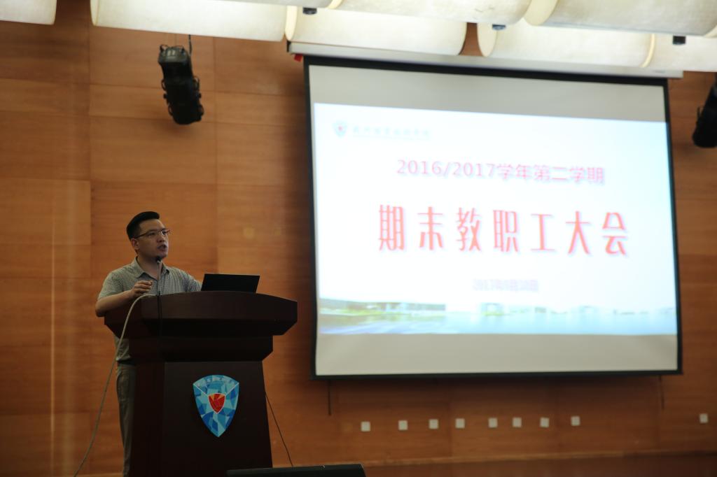 6月30日下午,我校在图书馆报告厅召开2016/2017学年第二学期期末教职工大会,学校党政班子成员、全校教职工出席大会,会议由校长贾文胜主持。