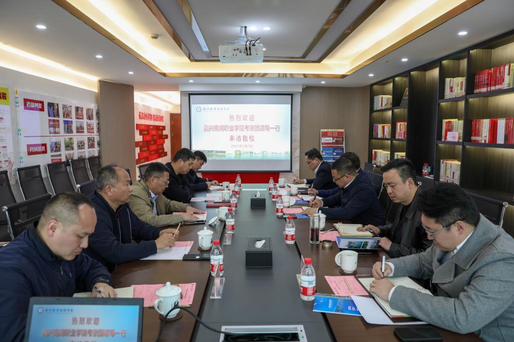 4月7日下午,嘉兴南湖学院党委副书记胡文蔚,嘉兴经济技术开发区经济发展部副部长马水强一行来校调研,嘉兴南湖学院办公室、教师发展与教学质量监控评估中心、继续教育学院相关负责人随行。我校党委副书记陈泉淼、副校长程利群,办公室、实训与设备管理处相关同志参与接待。