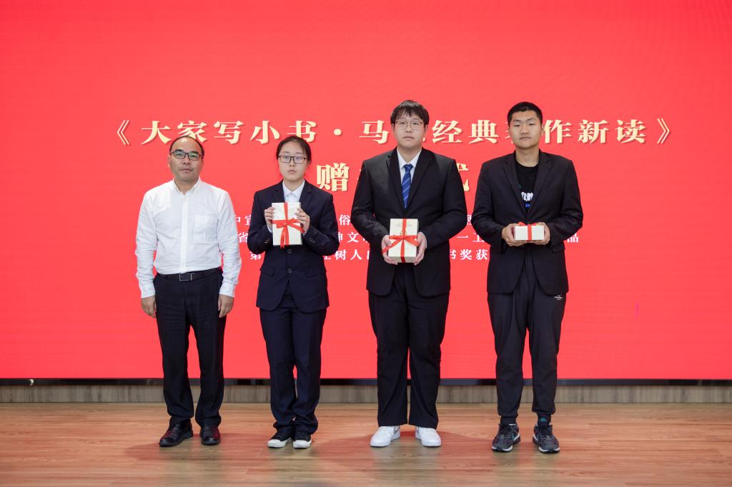 褚定华向大学生代表赠送了《大家写小书·马恩经典著作新读》丛书第一辑。希望同学们深入理解马克思主义基本原理,有助于大学生消除误解,也有助于增强大学生辨别力和洞察力,提升民族自尊心和自信心,更有助于推进马克思主义中国化、时代化,振兴当代青年精神。