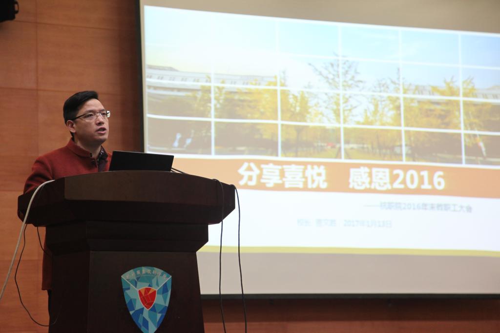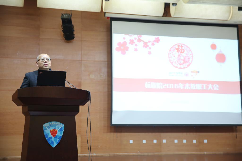 随后,校长贾文胜以“情聚杭职 共创未来”为题,回顾了我校20162017第一学期在社会影响、跨界融合、专业建设、师资队伍、学生工作、文化校园、交流合作、社会服务、和谐校园、党的建设等十个方面作出的努力和取得的丰硕成果。他指出,学校改革发展取得的这些成绩,离不开每一位杭职院的努力和奉献。同时,他对寒假期间的重点工作进行了布置,期待与全体教职员工乘梦飞翔、共创辉煌,同时祝大家度过一个平安祥和的春节、一个幸福快乐的寒假。