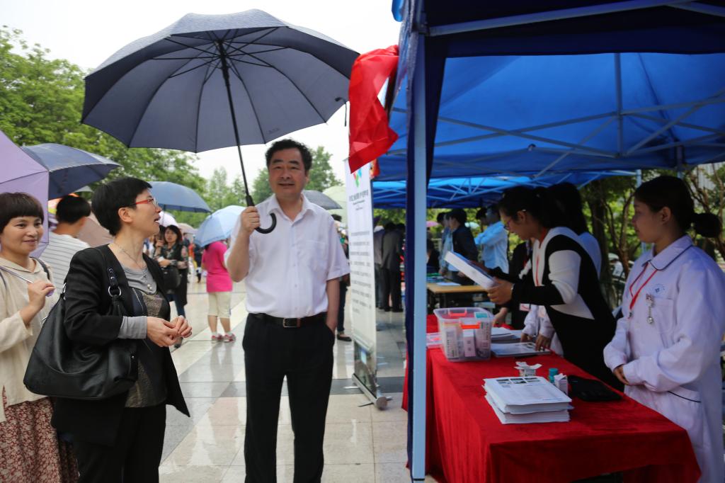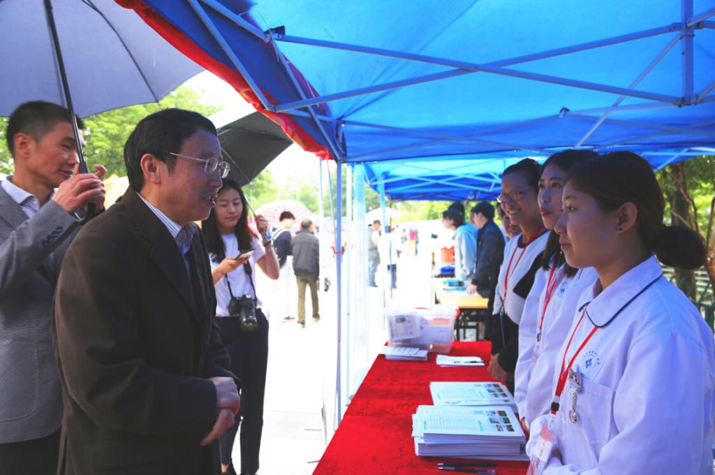 我校部分师生参加了此次职业教育活动周活动。刘希平厅长一行冒雨来到我校展位前,他问咨询台前身穿护士服的学生:“你们以谁作为榜样?”来自彩虹鱼康复护理学院的学生们异口同声地回答:“南丁格尔!”“我们杭州市也有像南丁格尔一样的人物,你们要像他们学习,努力成为新时代的‘南丁格尔’。”刘厅长对学生们提出了殷切期盼,并同我校副校长许淑燕进行了交流,充分肯定了杭职院这两年快速发展取得的办学成效。