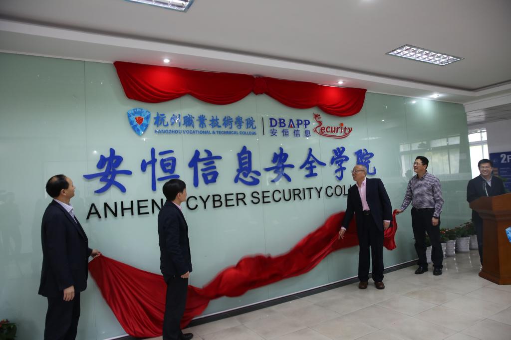 在出席签约仪式的全体人员的共同见证下,安恒信息董事长范渊和我校党委副书记赵一文分别在合作协议上签字。在热烈的掌声中,市保密局局长顾江、市经信委党委副书记楼建忠与安恒信息董事长范渊、我校党委书记安蓉泉共同为安恒信息安全学院揭牌。