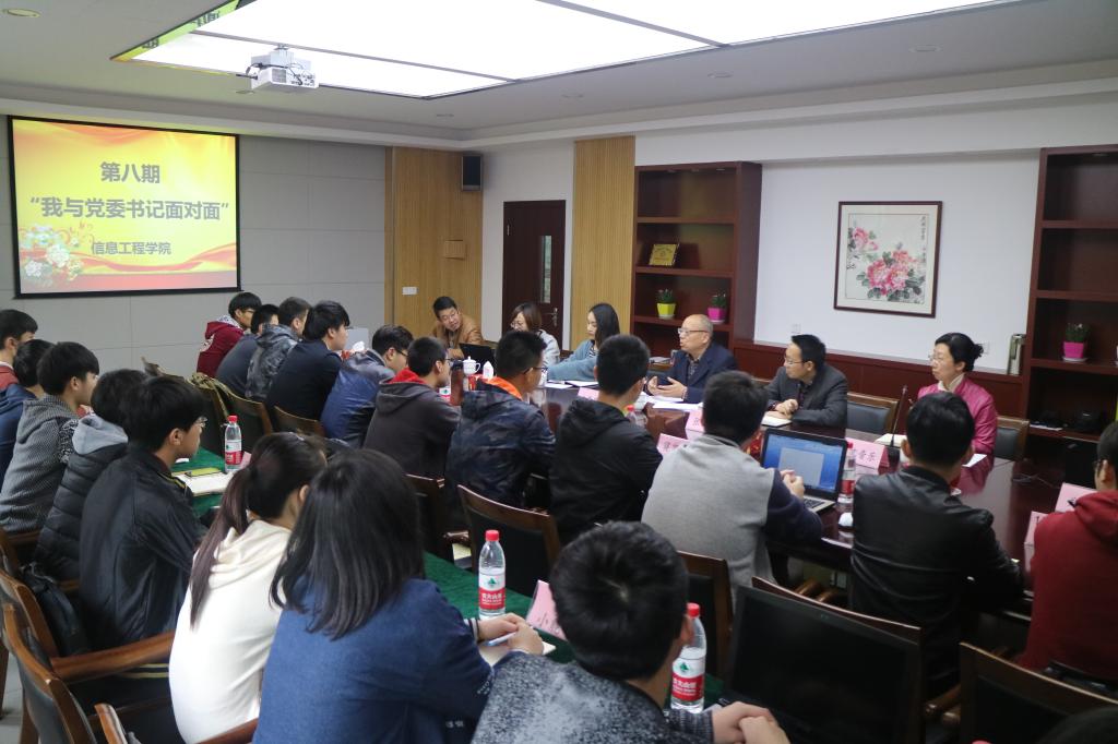 4月6日下午,第八期“我和党委书记面对面”来到信息工程学院。校党委书记安蓉泉,学工部、宣传部、信工院等相关部门负责人及三十多位学生代表共同参加了此次活动。