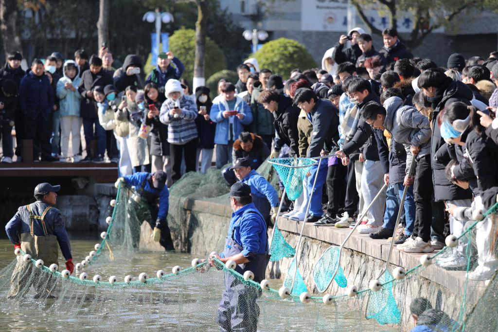 下午,波光粼粼的善湖畔围满了人,捕鱼师傅身着连体雨裤,一起收拢前期下好的渔网。鱼网渐拢,鱼迹渐现,一时之间,鱼儿翻腾,水花四溅,鱼跃水面的场景迎来围观师生的阵阵欢呼。活动现场,师生们兴奋地抱起还在跳动的大鱼,纷纷来到打卡点前合影留念。初冬的善湖畔,洋溢着师生的欢声和笑语。