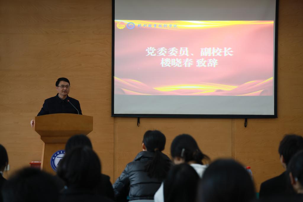 党委委员、副校长楼晓春受聘成为新一期“青马班”班主任。在开班致辞中,围绕如何更好地开展团员和青年主题教育,成长为真正的青年马克思主义者这一主题,他向学员们提出了三点希望:一是正确认识“青马工程”的意义,拿稳历史的接力棒。希望同学们能够高度重视在学生干部领航班期间的学习,做好党的助手和后备军;二是深入开展“守根铸魂”大学习,做到理论入耳入脑入心,希望青马班的同学能坚持读原著、学原文、悟原理,重温的“思想旗帜”“坚强核心”“强国复兴”“挺膺担当”4 次专题学习,认真做好集体学习和个人自学;三是注重理论与实践相结合,在学思践悟中不断提升自我:一方面善于发现和利用好身边的实践例证资源、红色资源,切实感受身边发生的精彩蝶变,另一方面,通过深入开展各类志愿服务、社会实践活动,在奉献社会、服务群众中锻炼成长。