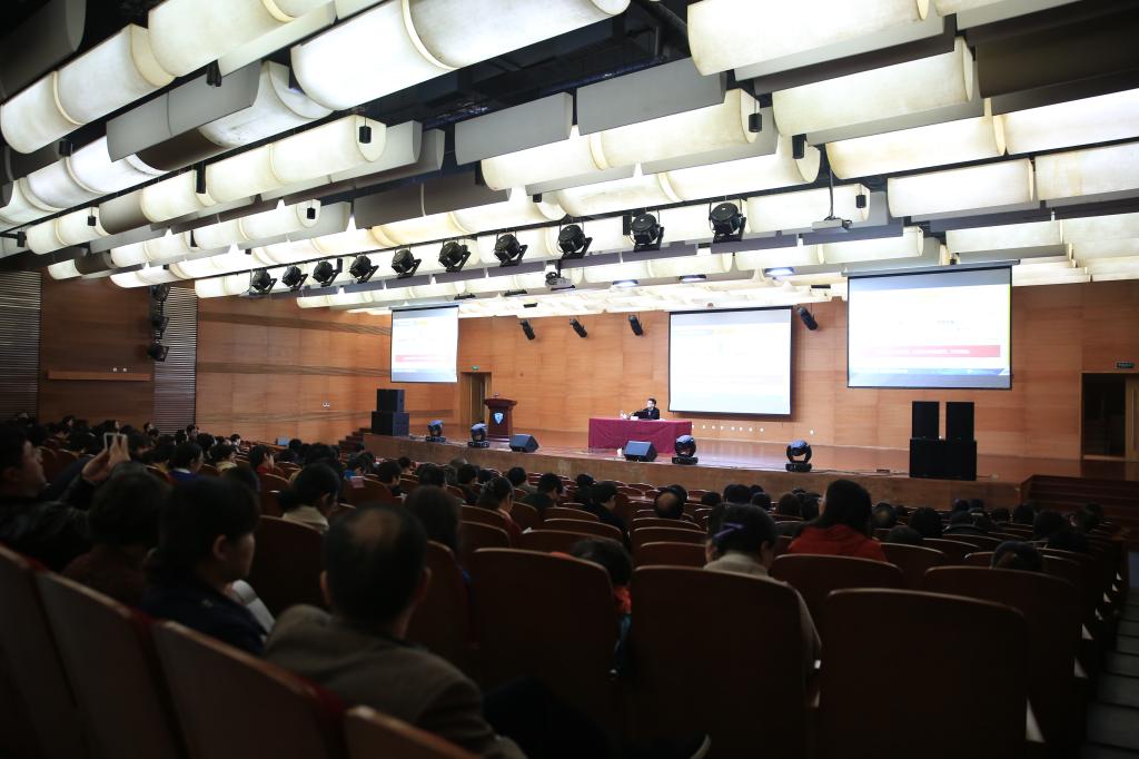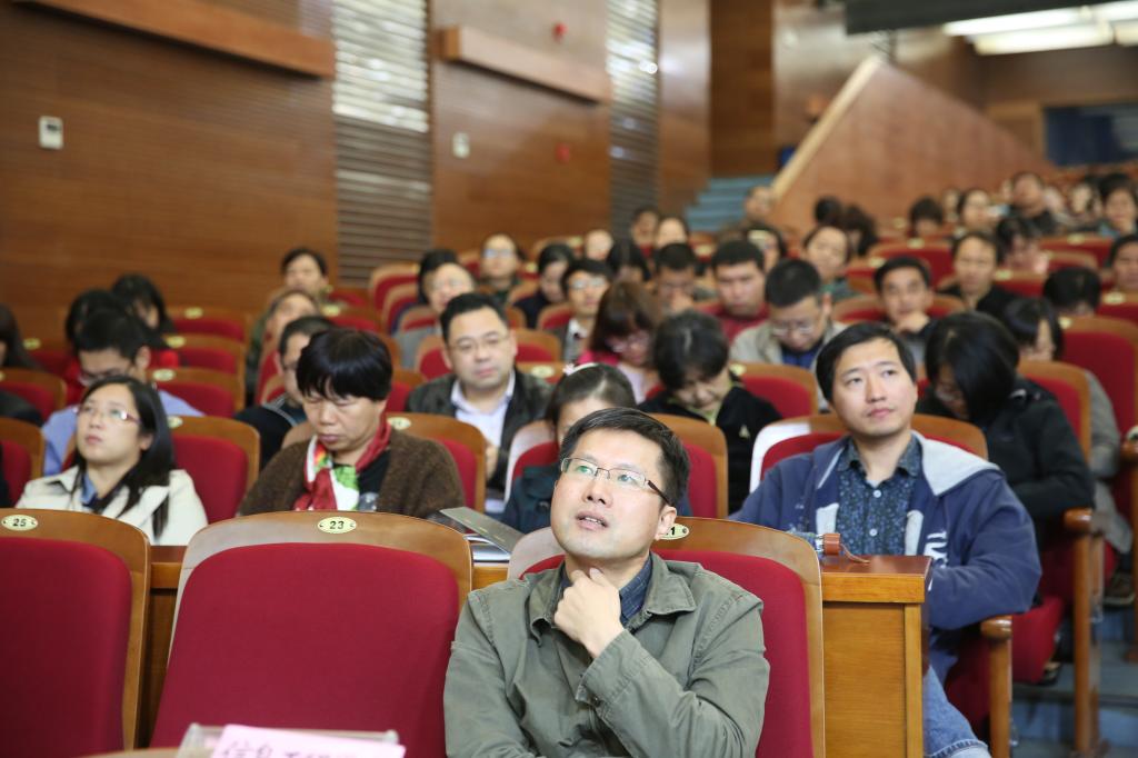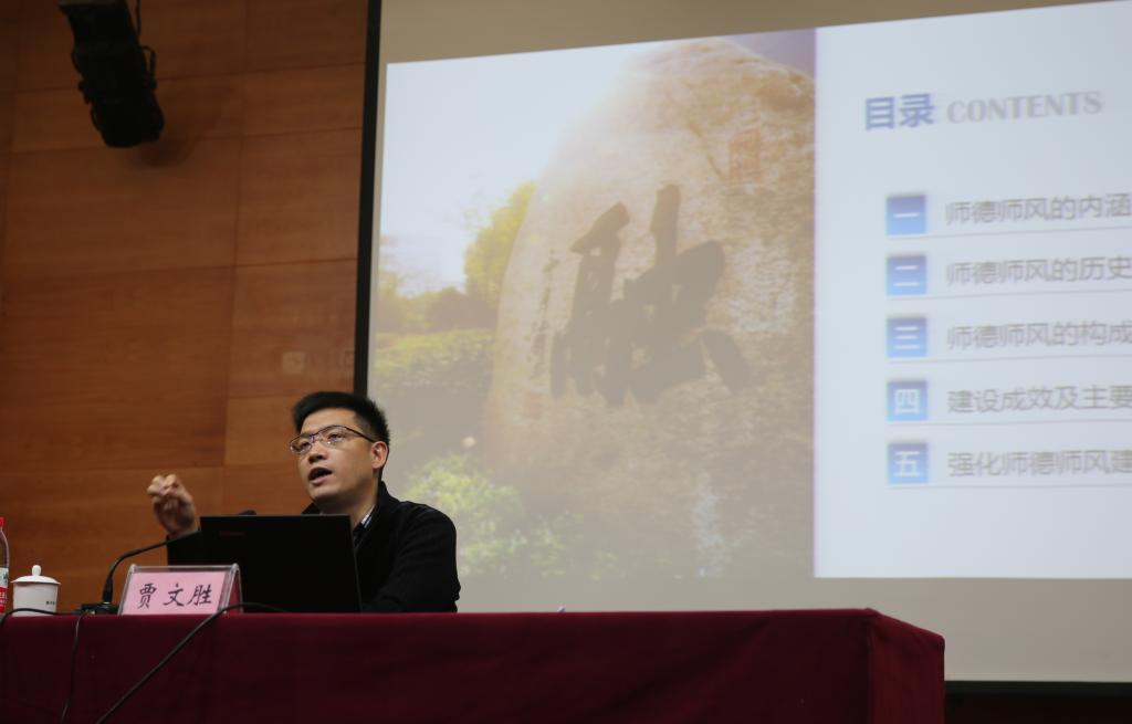 贾文胜从解文说字切入,分析了“师”、“德”、“风”这三个字的内涵,从历史的角度阐述了孔子、孟子、朱子、韩愈等儒家代表对师德师风的概括和对教师的要求。在引经据典的同时,将这些大师们的观点与当今的社会现实相结合阐述了他自己独到的见解。他从近代以来的师德师风教育讲到了习近平总书记对教师的殷切希望。回顾了自己从事教育事业一路走来的感悟,以谦虚的态度,生动典型的案例,朴实而富于感染力的语言分析了师德师风的构成要素,并总结回顾了我校近年来在先进师德师风建设中涌现出的大批师德先进典型,也剖析了目前教师在师德师风方面存在的问题。