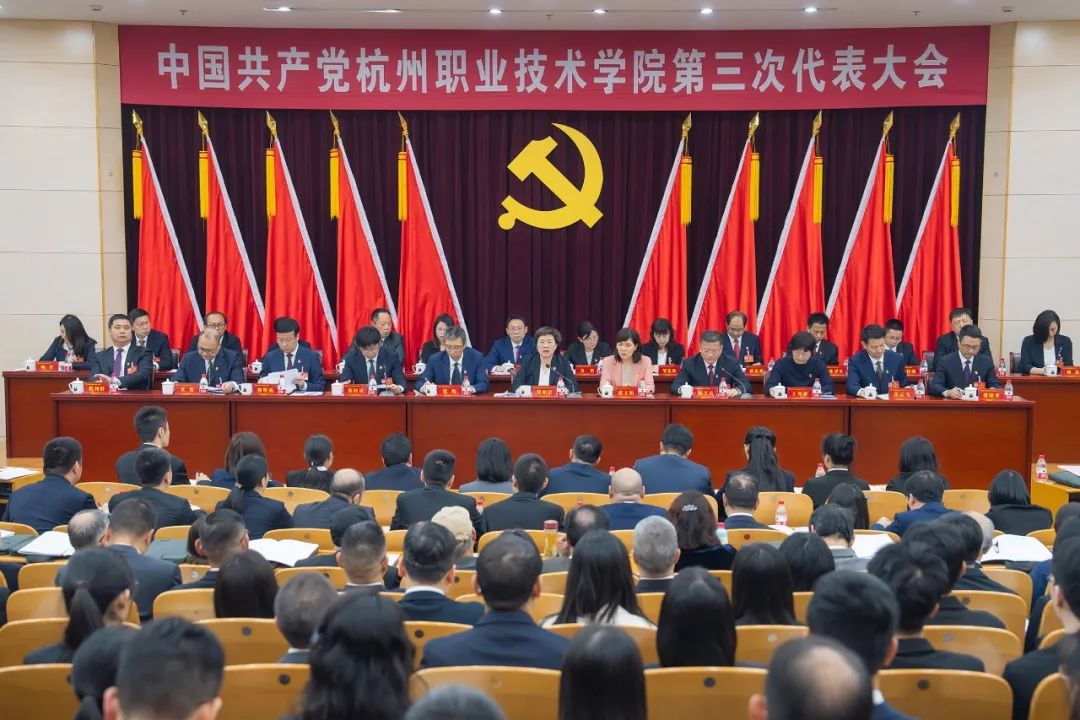 行政楼报告厅内气氛热烈,主席台上方悬挂的“中国共产党杭州职业技术学院第三次代表大会”横幅映入眼帘,金色的党徽和鲜艳的红旗分外夺目。市委常委、组织部长刘嫔珺出席大会并讲话。市委组织部副部长、市公务员局局长虞文娟,市委教育工委副书记、市教育局党组书记、局长钮俊等领导应邀出席。