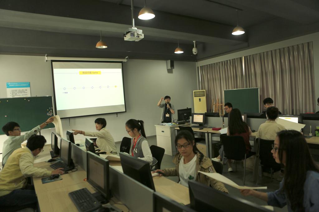 接着第二节课,观摩团来到102动画制作室,这里正在进行的是王启宾老师的《故事漫画创作》课程。他精心设计了团队项目成员招募、小游戏等教学环节,让学生在设计自己的团队名称、口号以及游戏环节中懂得了团队合作的重要性,游戏结束后王启宾也通过让学生自高奋勇上台讲解本组作品,这种教学形式提高了学生的语言表达和创新能力,最后他对学生的游戏作品进行分析,巧妙的让学生在掌握专业知识和专业技能的同时,也让学生深刻体会到了自己应该重视在语言表达、创新能力、造型构图布局能力、语言描述和图像表达、时间效率意识、沟通管理能力、以及团队协作等职业素养的养成。