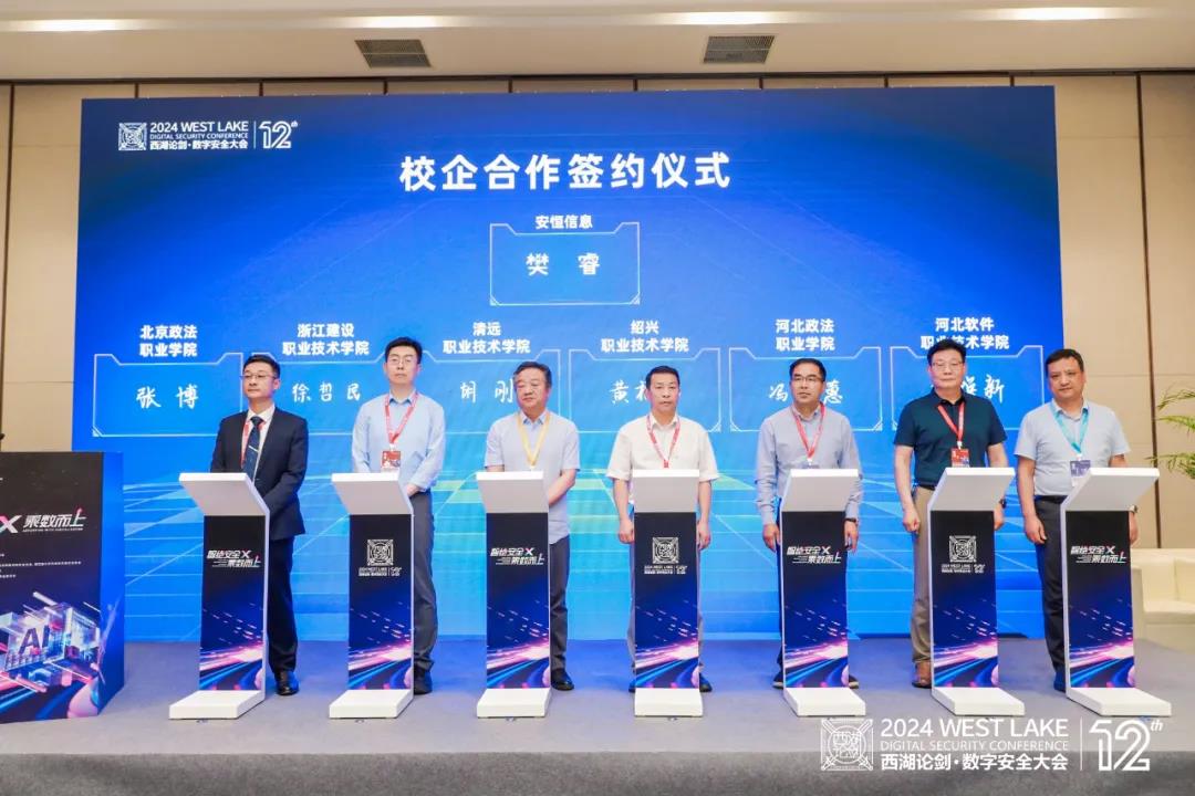 安恒信息高级副总裁苗春雨与工业和信息化部教育与考试中心谭志彬签订战略合作协议,并与北京政法职业学院、浙江建设职业技术学院、河北软件职业技术学院、绍兴职业技术学院、清远职业技术学院、河北政法职业学院进行了联合签约。