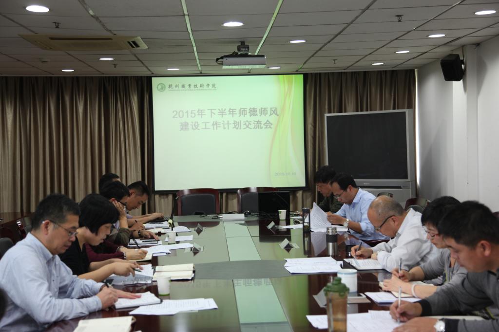 10月10日下午,我校2015年下半年师德师风工作计划交流会在第一会议室召开。校党委书记安蓉泉出席会议并讲话,副校长许淑燕主持会议。各二级学院、继续教育学院、人文社科部、图书信息中心、资产经营管理有限公司以及职能部门主要负责人参加会议。
