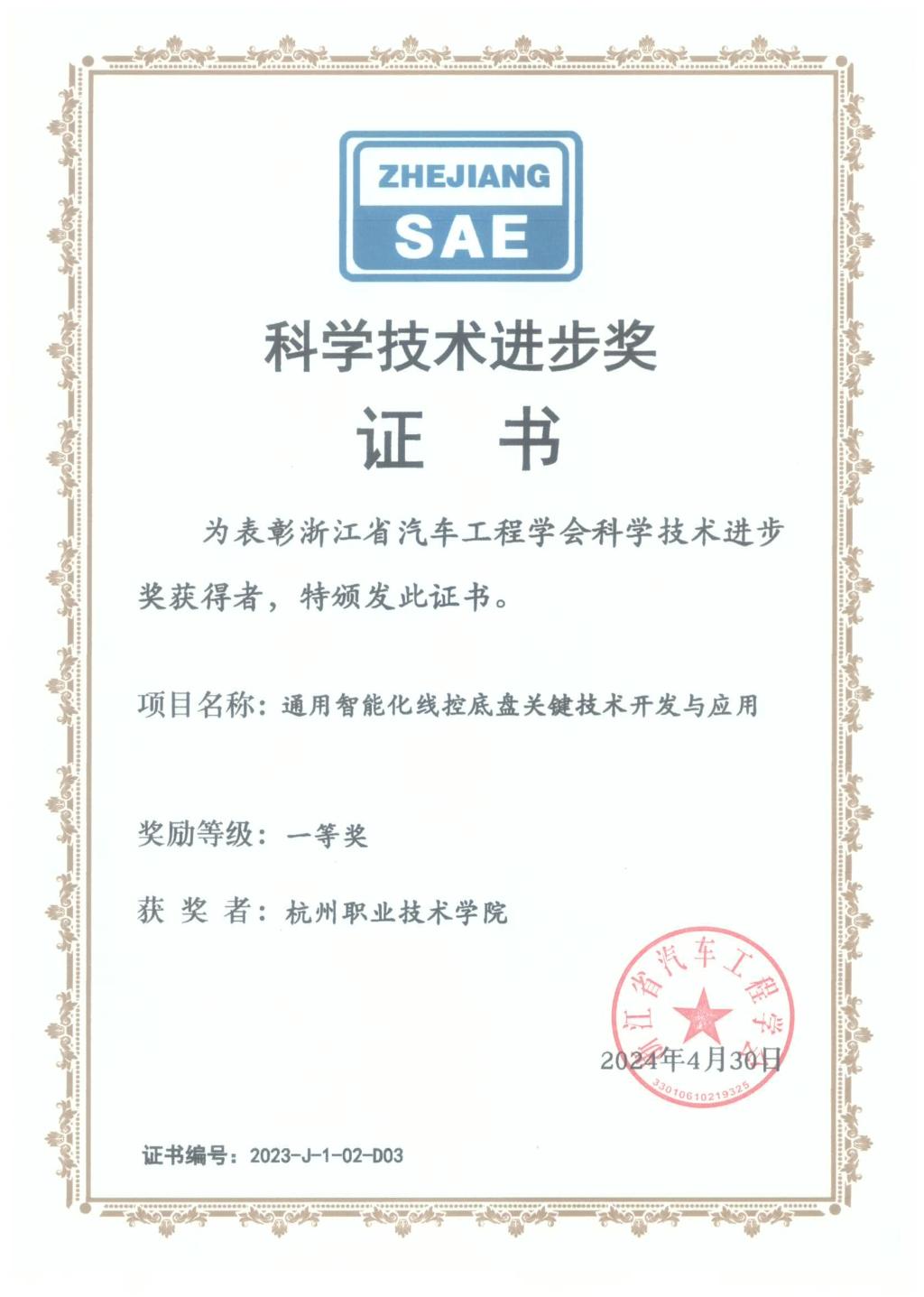吉利汽车学院杨爱喜团队主持的《通用智能化线控底盘关键技术开发与应用》科研项目获得浙江省汽车工程学会2023年度科技进步奖一等奖。