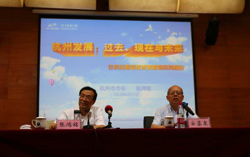 张鸿铭指出,职业教育正迎来发展的黄金期,大有可为。杭职院作为我市职业教育的排头兵,有着较高的教育教学水平和人才培养质量,毕业生就业率非常高,尤其是2015届毕业生中85%有意向留在杭州工作,为杭州市经济社会发展和产业的转型升级做出了突出贡献。针对我校下一步发展,他希望杭职院能始终保持“排头兵”优势,认真落实立德树人的根本任务,进一步明确办学定位、创新体制机制、加强“双师型”队伍建设,培养出更多富有理想正气、勇于实践和创新的人才。广大师生要紧紧抓住“大众创业、万众创新”的时代机遇,勤于学习,掌握技能,积极参与杭州的经济建设,展现新才干,贡献新力量。张鸿铭表示,市委市政府将一如继往地高度重视杭职院的建设,确保学校在服务地方产业转型升级中获得更好更快地发展。