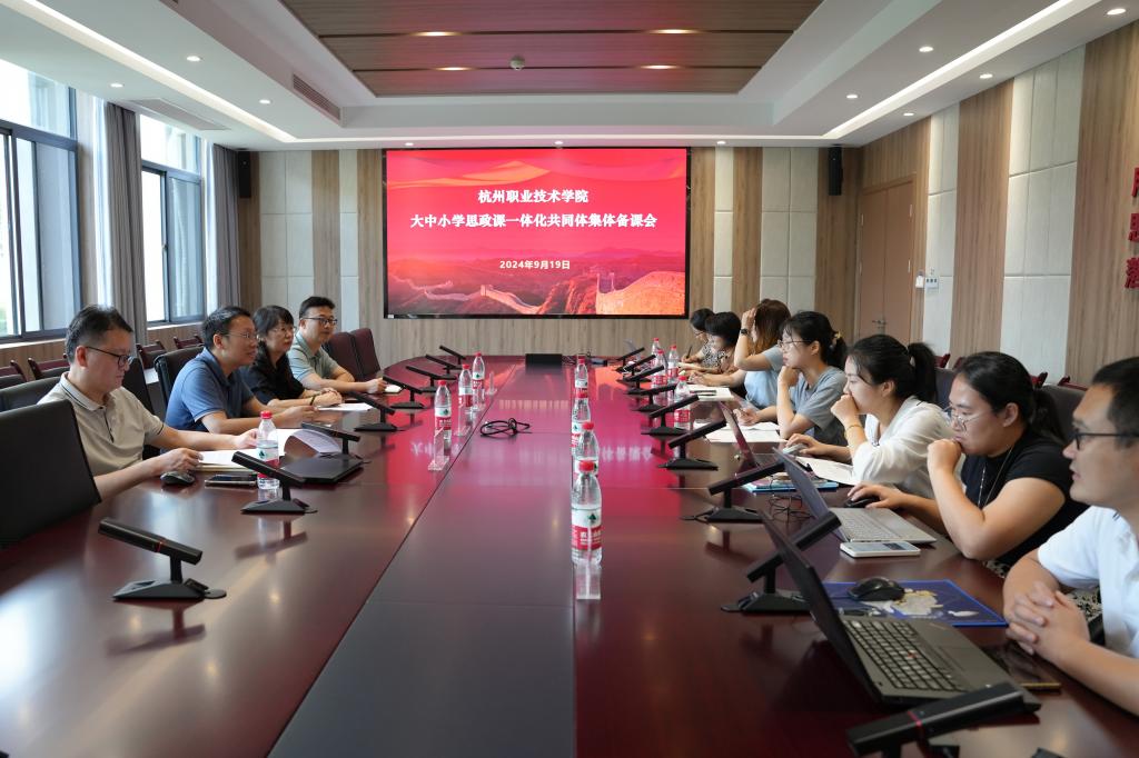 为深入贯彻落实习近平总书记关于学校思想政治理论课建设的重要指示精神,扎实推进杭州市大中小学思政课一体化共同体建设,9月19日,由杭州职业技术学院牵头成立的两个大中小学思政课一体化共同体在马克思主义学院6108召开集体备课会。校党委委员、宣传部长张杰,马克思主义学院党总支书记、院长邹宏秋,宣传部副部长伏志强,马克思主义学院副院长王志强参加会议。会议由邹宏秋主持。