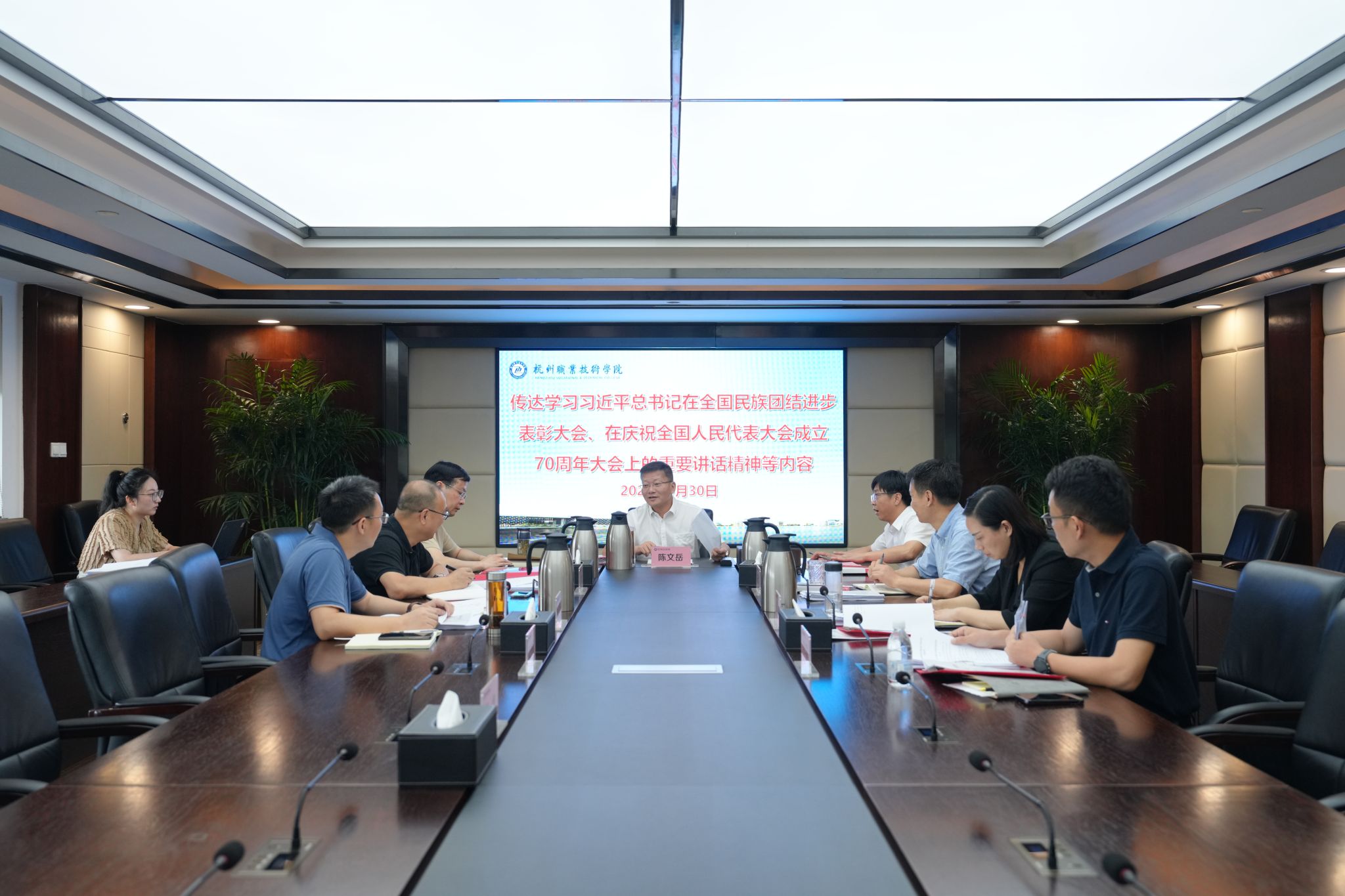 9月30日上午,学校党委会举行“第一议题”学习会,专题传达学习习近平总书记在全国教育大会、全国民族团结进步表彰大会、庆祝全国人民代表大会成立70周年和庆祝中国人民政治协商会议成立75周年大会上的重要讲话精神,并结合学校实际研究贯彻落实措施。校党委书记陈文岳主持会议并讲话,全体校领导班子成员参加。