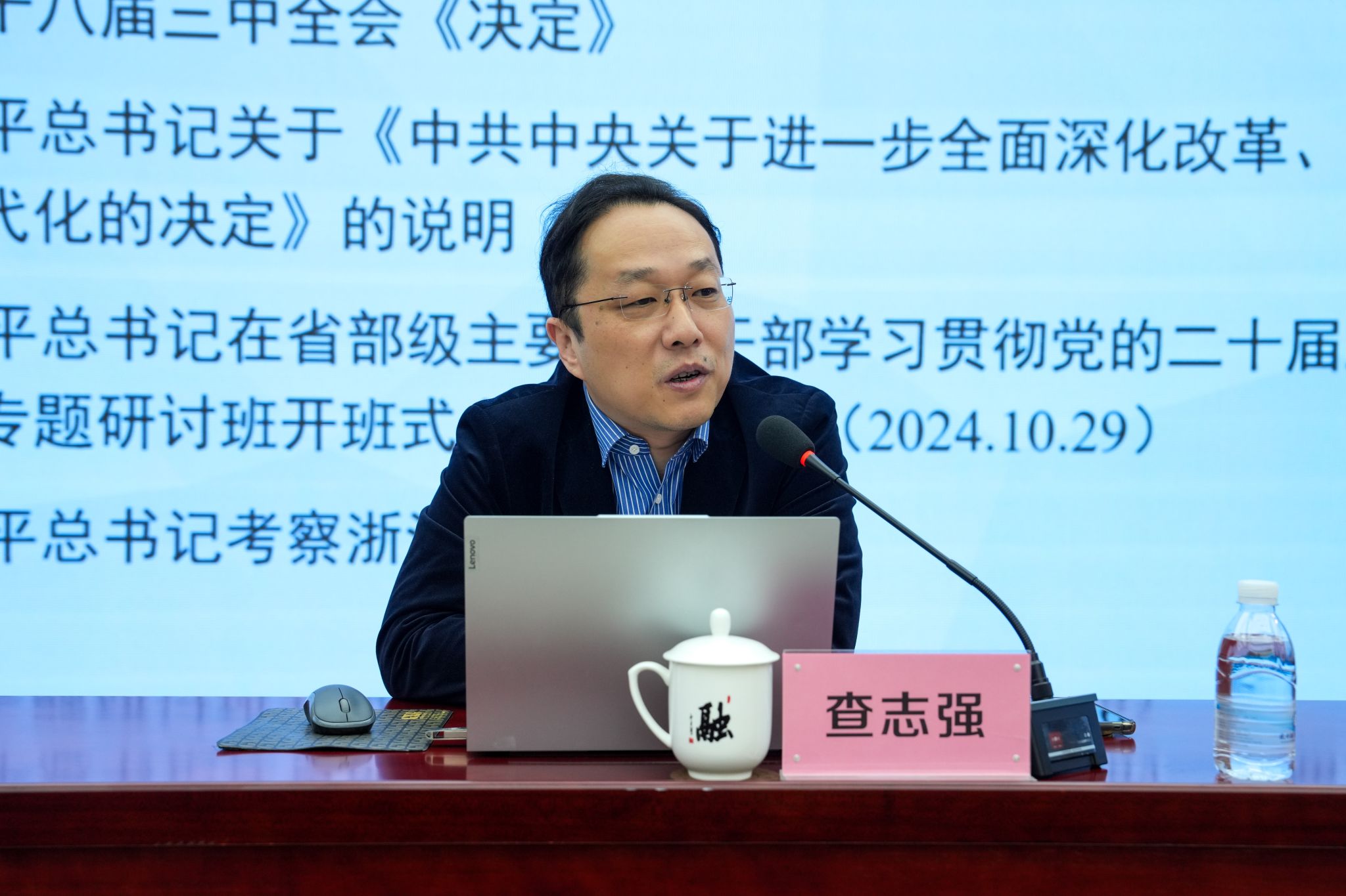 本次培训邀请浙江省社会科学院党委副书记、院长查志强作题为《以经济体制改革为牵引塑造发展新优势新动能--党的二十届三中全会精神学习体会》的辅导报告,全面解读全会精神的丰富内涵、精髓实质、核心要义,为与会同志更深刻地理解领会全面深化改革、推进中国式现代化的重大意义、重大原则和重大举措提供了理论指导,为更好理解和贯彻我省全面深化改革推进中国式现代化省域先行的重要战略提供了科学指引。