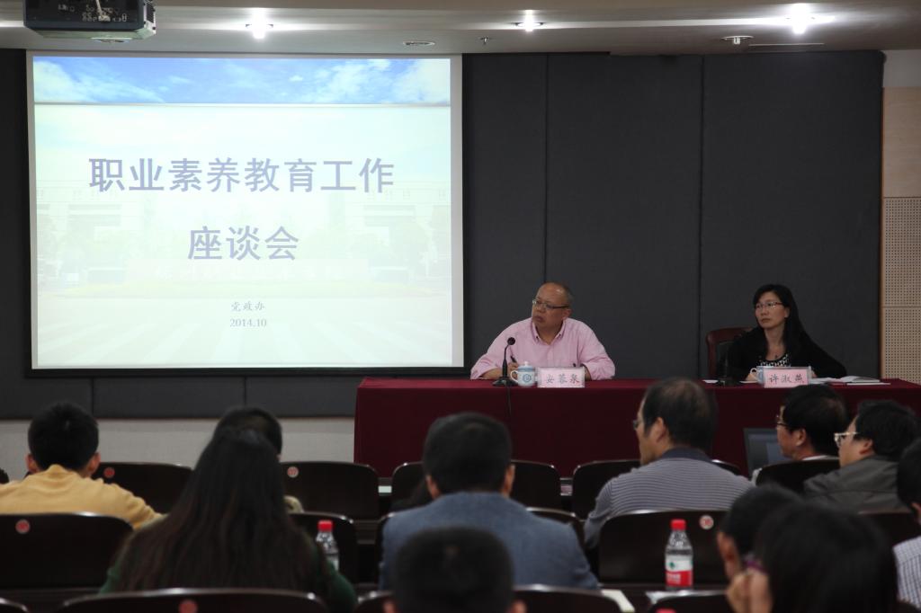 10月23日下午,我校职业素养教育工作座谈会在第三会议室召开。校党委书记安蓉泉,副校长许淑燕,党政办、教务处、人文社科部相关负责人、各专业负责人、专业教师及学生工作人员参加了会议。会议由许淑燕主持。