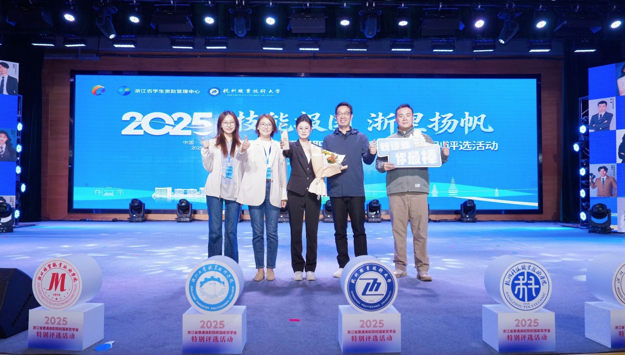 展示环节,选手们结合专业学习、科研竞赛等领域分享成长故事。他们中既有手握专利的技术尖兵,也有反哺乡邻的实践先锋,充分展现浙江高职学子的综合素养与责任担当。评选采用评审系统现场投票,经过激烈角逐,我校学子钱诗蝶等10名学生获得2025年浙江省普通高职院校国家奖学金特别推荐资格,这也是我校第五次获此资格。