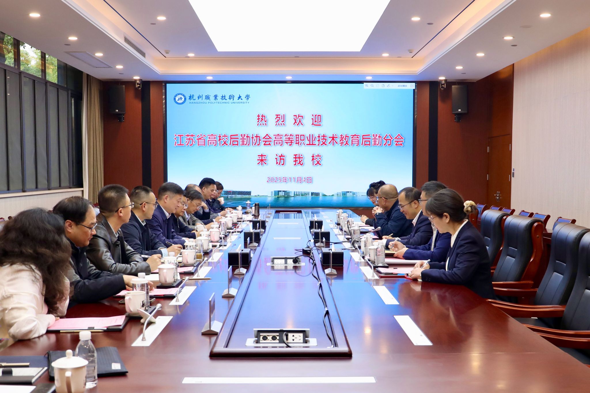 来访人员一行听取了学校餐厅经营管理、物业服务管理、后勤队伍建设等方面的介绍,依次分享了本校基本情况及后勤经验,表示杭职大后勤管理相关经验具有重要借鉴学习意义,希望双方能够进一步拓宽合作领域,加强人员往来,共同推动高校后勤服务事业迈上新台阶。