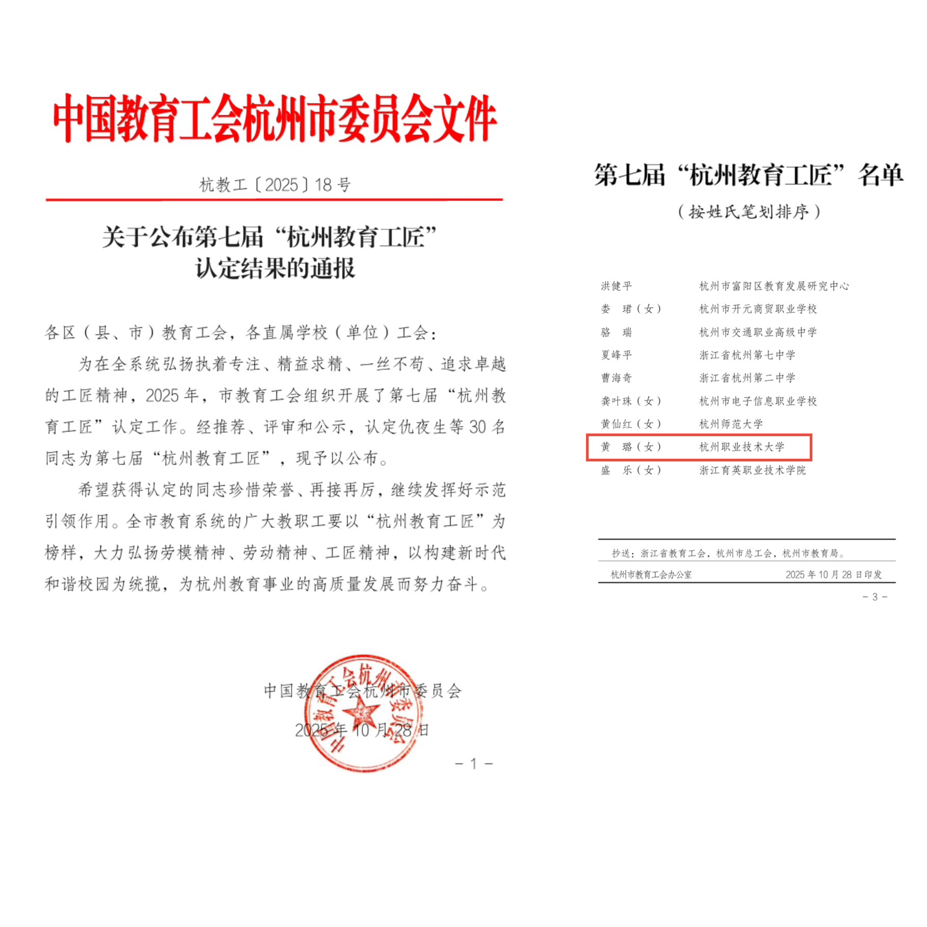 近日,中国教育工会杭州市委员会公布2025年度“杭州教育工匠”名单,我校动漫游戏学院黄璐老师被认定为第七届“杭州教育工匠”。