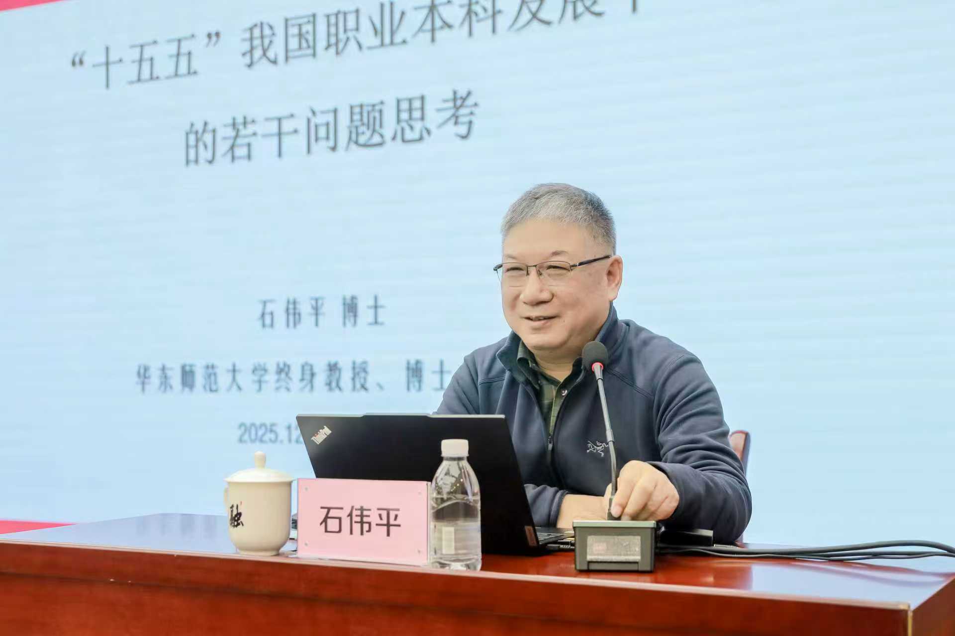为更好把握高水平职业本科学校建设新形势新要求,科学推进学校“十五五”事业发展,12月25日下午,学校召开第三次“十五五”发展论坛,特别邀请我国职业技术教育学专业的第一位博士生导师、华东师范大学终身教授石伟平教授来校做专题辅导报告。会议由学校党委书记陈文岳主持,校领导班子成员,全体中层干部,各党支部书记,第二期“菁英计划”人员等参加本次发展论坛。