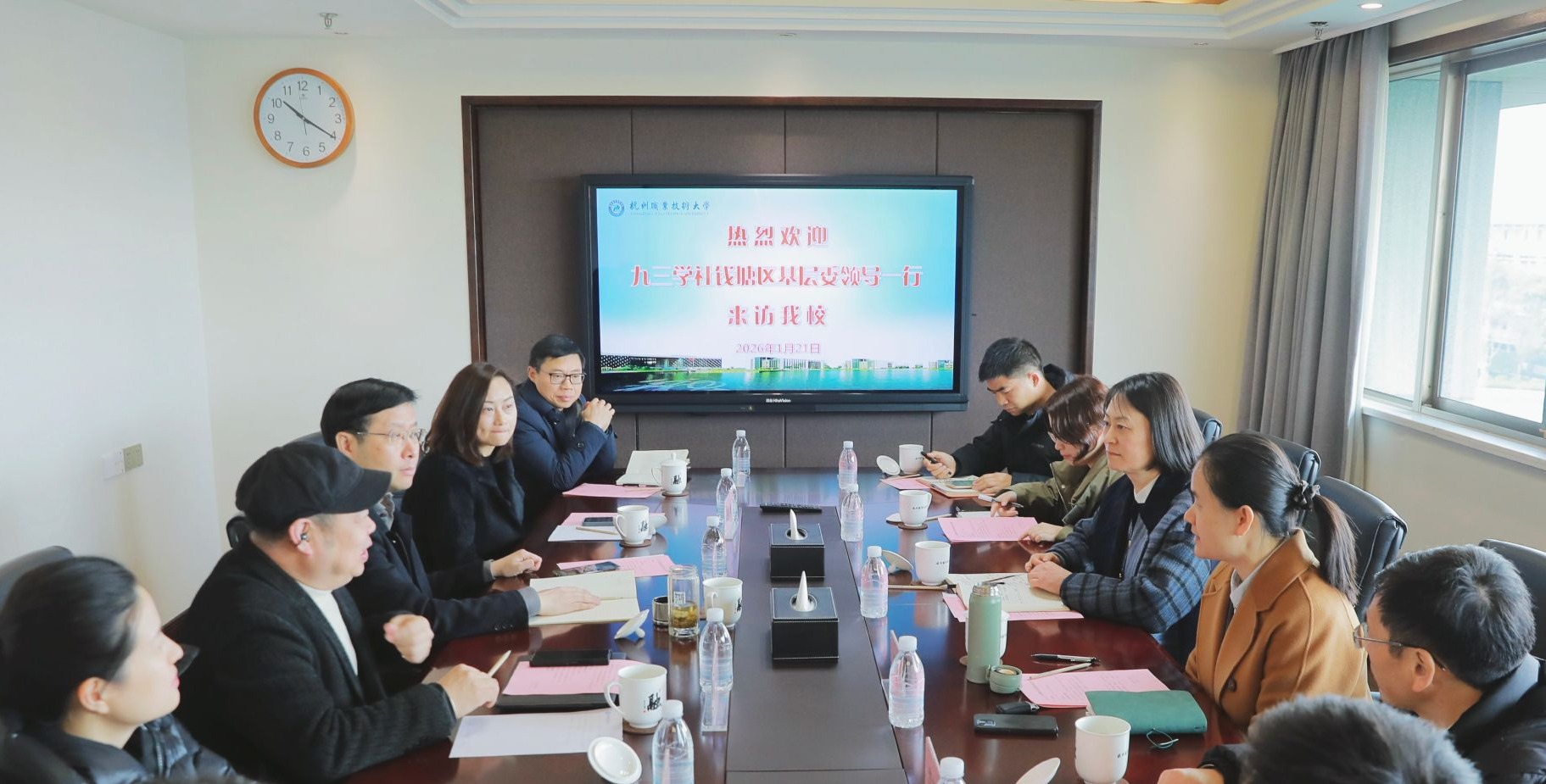 1月21日上午,钱塘区政协副主席、九三学社杭州市钱塘区基层委主委张海平一行来校调研,钱塘区委统战部常务副部长戎婷蓉陪同。学校党委副书记赖明诚、校党委统战部负责人、校九三学社社员代表等参加座谈。双方围绕深化校地企合作、推进人才共育等深入交流。