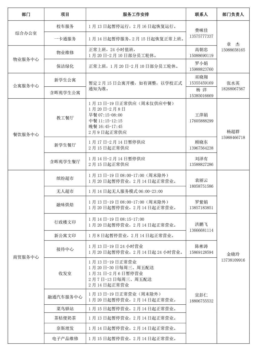 根据学校寒假放假安排,为确保学校后勤服务工作平稳有序运行,现将寒假期间后勤服务中心、资产公司服务工作安排通知如下: