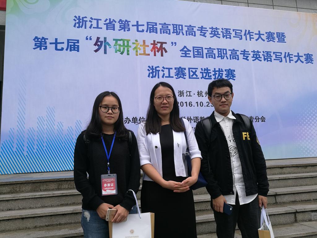 10月23日,浙江省第七届高职高专英语写作大赛在杭州科技职业技术学院举行,来自全省44所高职高专院校的120位选手参加了本次比赛。由我校人文社科部外语教研室陆燕萍和郑秋云老师指导的商贸旅游学院市场营销专业学生徐莹荣获特等奖、郭喜涛荣获三等奖,延续了我校2015年省赛特等奖的优异成绩。