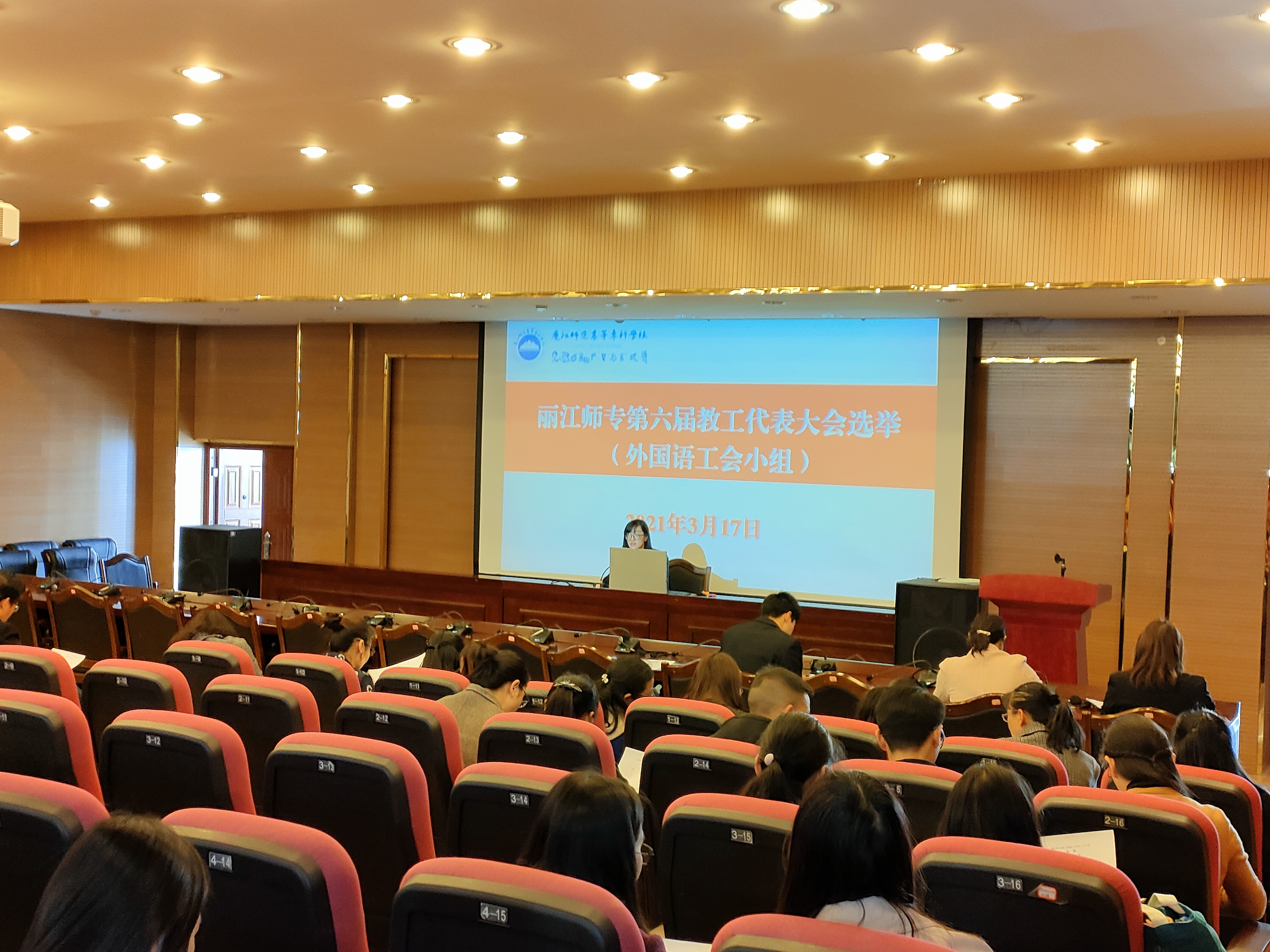 2021年3月17日13时,外国语学院在实训楼318召开全院教职工大会,选举丽江师范高等专科学校第六届教工代表大会的外国语工会小组代表。此次选举大会由学院党总支书记李佳主持。