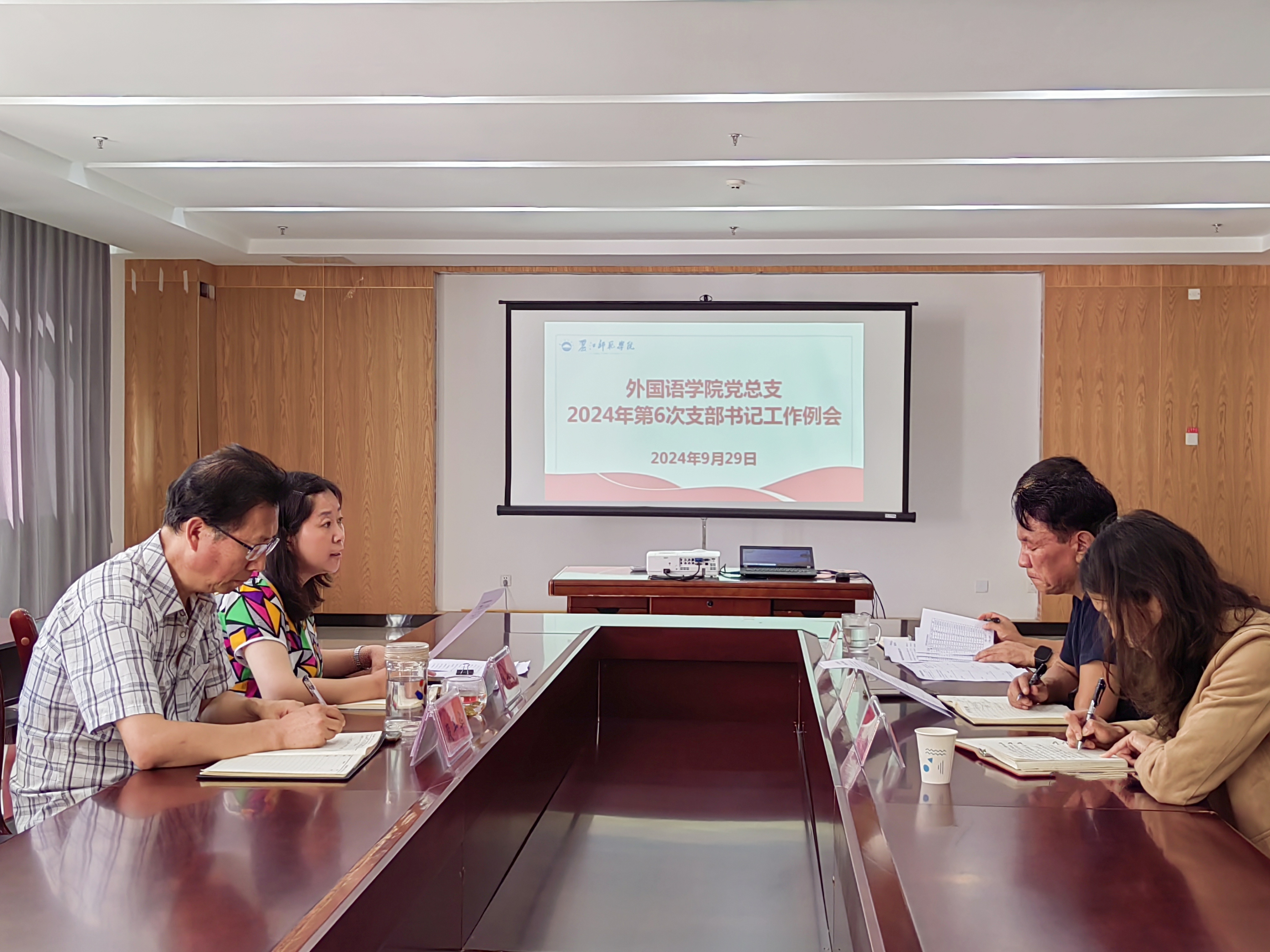 9月29日,外国语学院党总支在励志楼401召开2024年度第6次党支部书记工作例会,学院党总支副书记、专职组织员、教师党支部书记、学生党支部书记参加会议,会议由学院党总支书记李根艳主持。