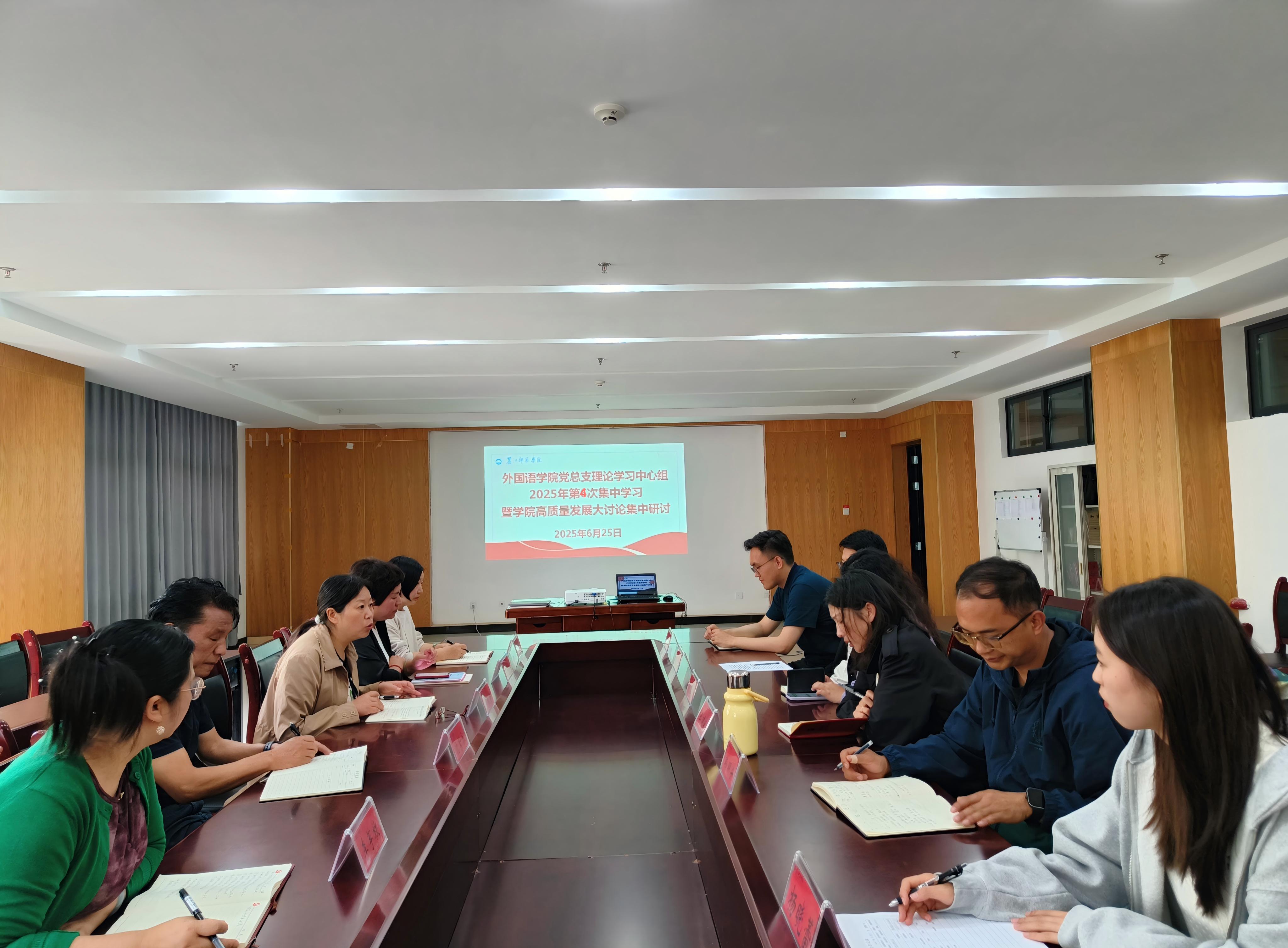 6月25日上午,外国语学院党总支理论学习中心组开展2025年第4次集中学习研讨,学院领导班子成员、总支支委、党支部书记、综合办主任、教务办主任、学工办主任以及新进教师参加研讨。学院党总支书记李根艳主持会议。