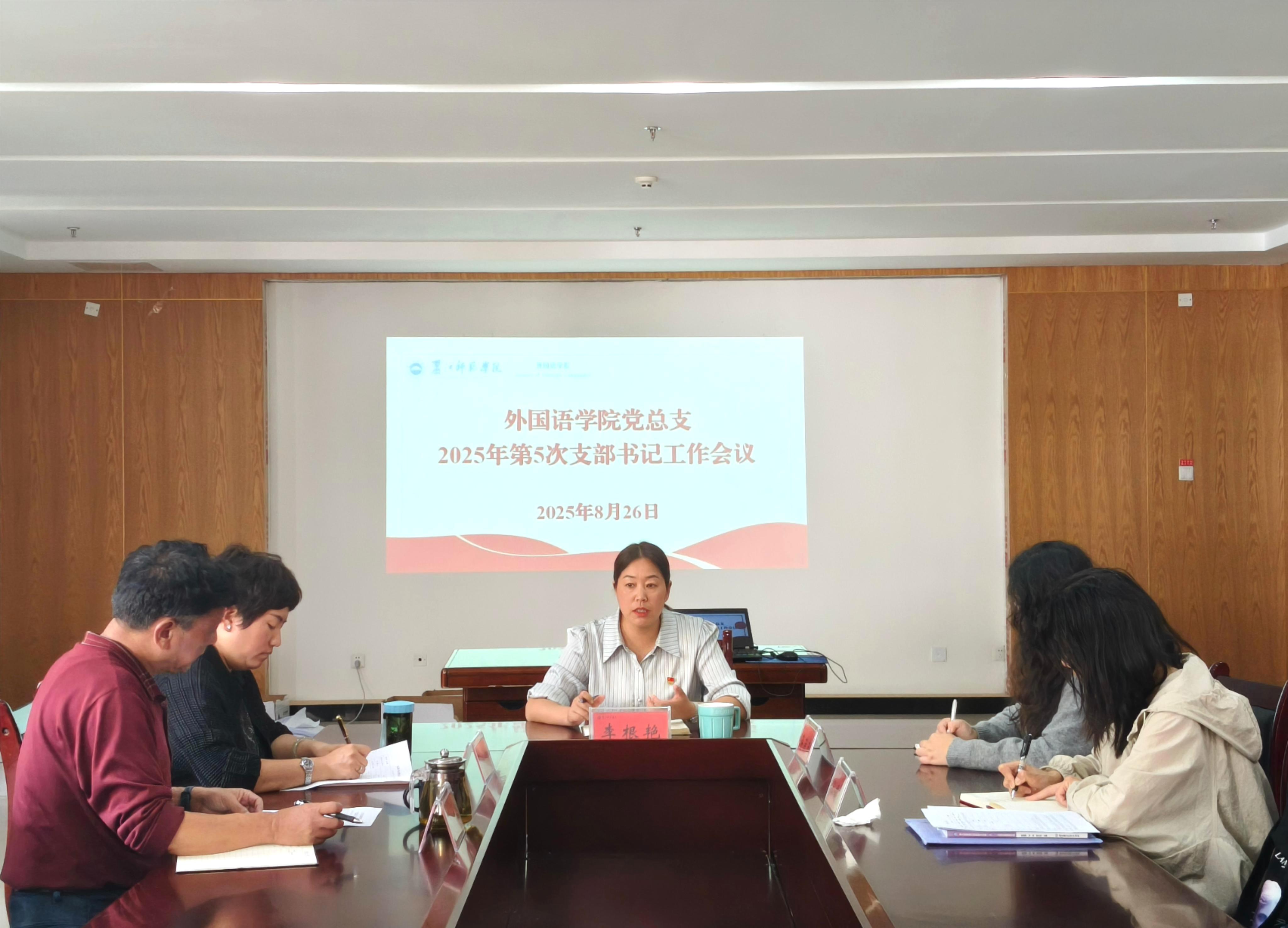 8月26日,外国语学院党总支在励志楼401会议室召开第五次党支部书记工作例会。会议由党总支书记李根艳主持,学院党总支副书记、专职组织员、教师党支部书记及学生党支部书记参加会议。