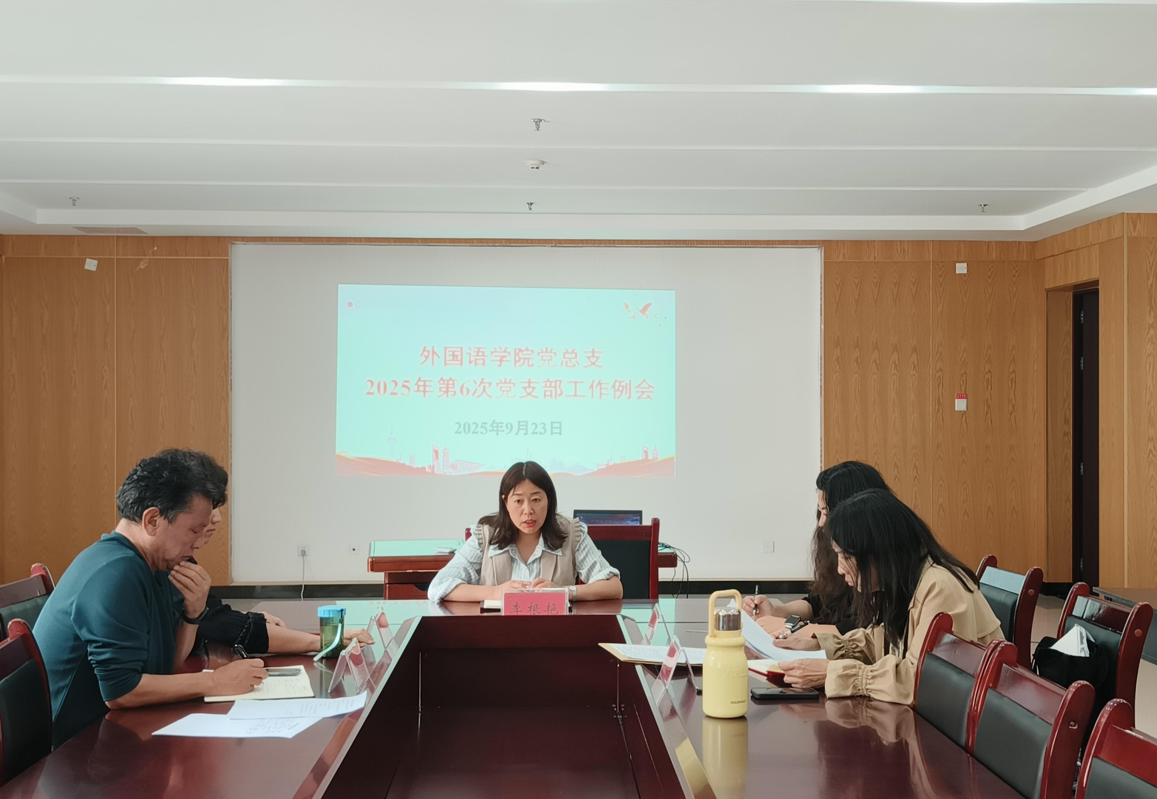 2025年9月23日下午,外国语学院在励志楼401会议室召开2025年第6次党支部书记工作例会。党总支书记李根艳主持会议,党总支副书记、专职组织员、教师党支部书记、学生党支部书记参加会议。