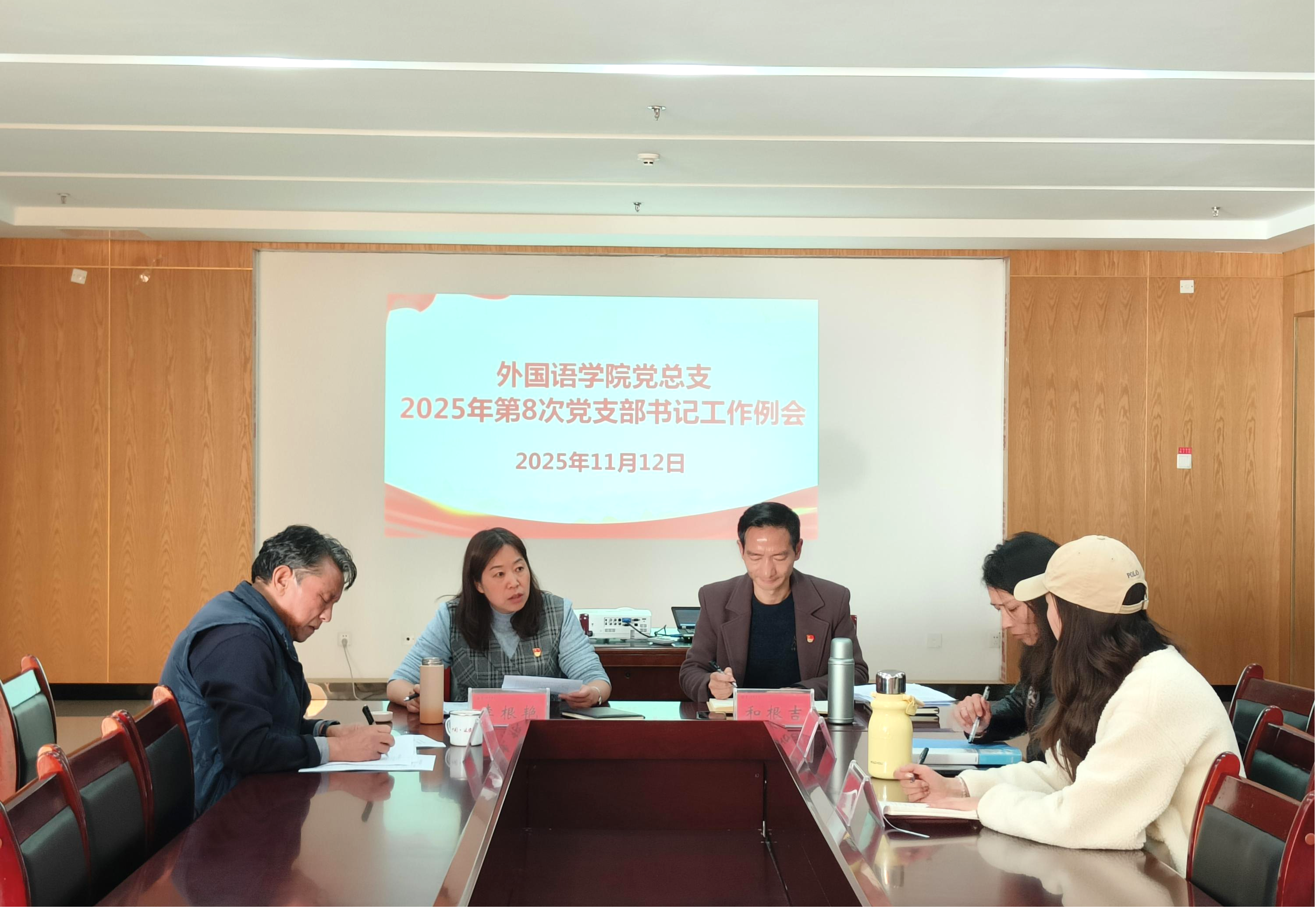 11月12日,外国语学院党总支在励志楼401会议室召开2025年第8次党支部书记工作例会。会议由党总支书记李根艳主持,党总支副书记、专职组织员及学生、教师党支部书记参加会议。