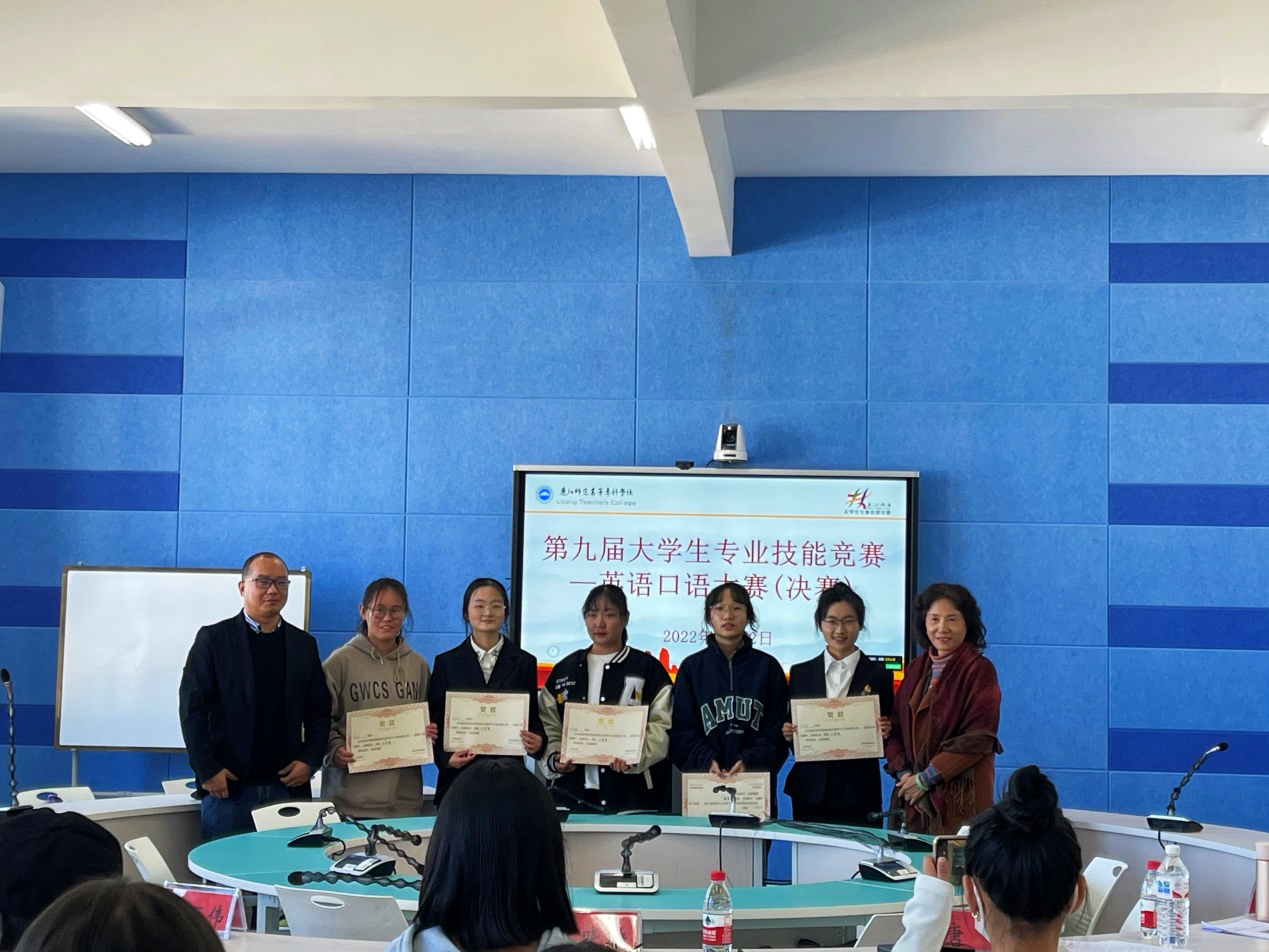 2022年12月2日中午1点,丽江师范高等专科学校第九届大学生专业技能竞赛英语专业“英语口语”比赛在求是楼502举行,来自各班的14名同学参加了本次比赛,产生了一等奖1名、二等奖2名和三等奖3名。