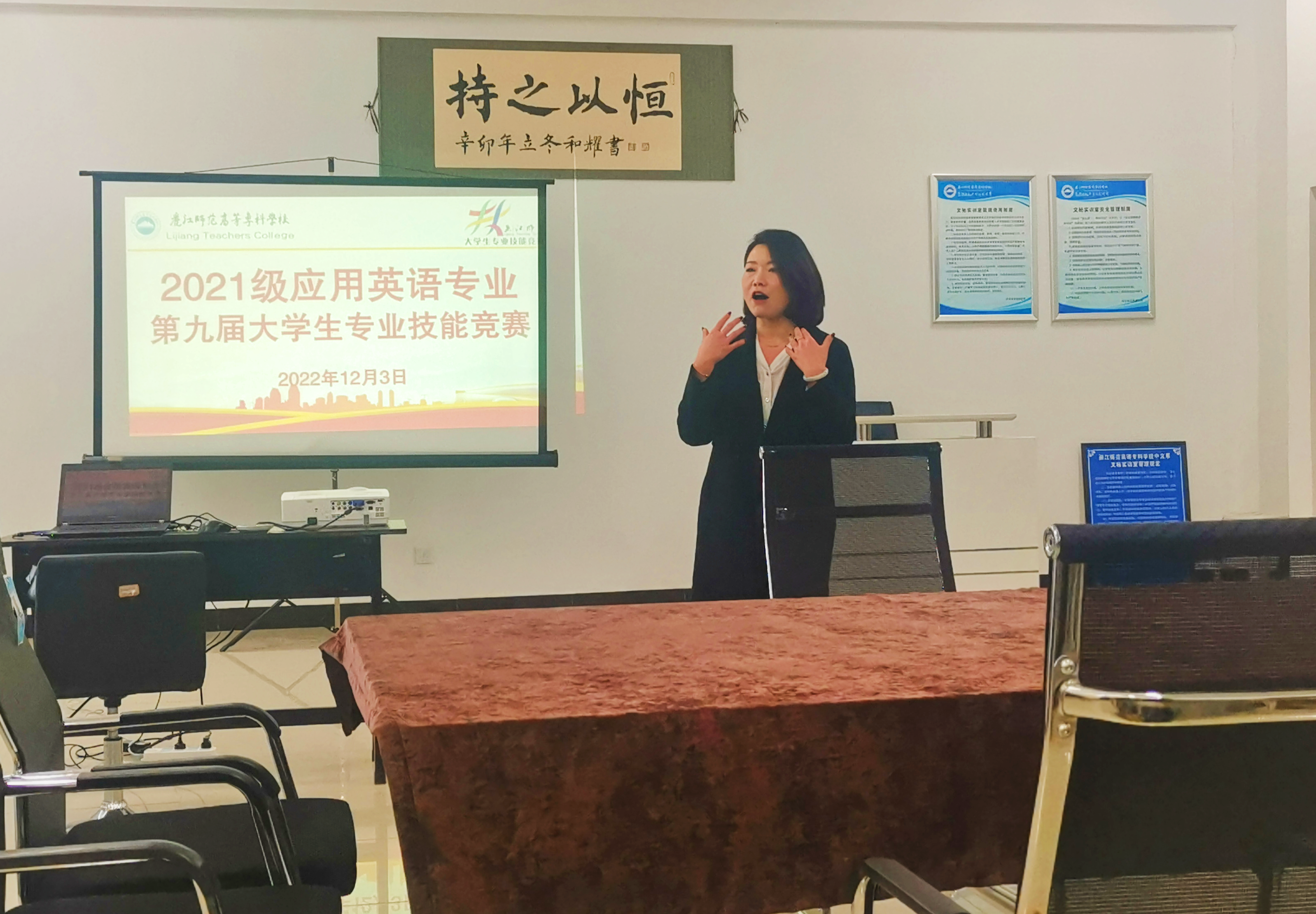 此次比赛的主题为涉外秘书英语实务”,应用英语专业76名学生参加。通过初赛,推选10个参赛队进入决赛。决赛于2022年12月3日9:00在求是楼602综合文秘实训室举行,评委由2位来自企业的专家和3位校内教师组成,2022级应用英语专业25名学生代表到场观摩比赛。参赛队以安排行程”“召开会议接待宾客”“接打电话”“求职面试”“预订机票”等涉外秘书工作情境进行模拟并口译关于秘书英语实务的中文选段,通过激烈的角逐,产生了1个一等奖团队,1个二等奖团队,1个三等奖团队。同学们在场上精彩的情景模拟和流利的英语口语表达获得了评委一致地肯定,同时评委就模拟过程中需要注意的礼仪、小组交流过程中的肢体语言等运用、注重细节语言的表达等方面提出了很多中肯的意见。应用英语教研室主任杨秋仙副教授表达了深化校企合作、人才共育的愿望。
