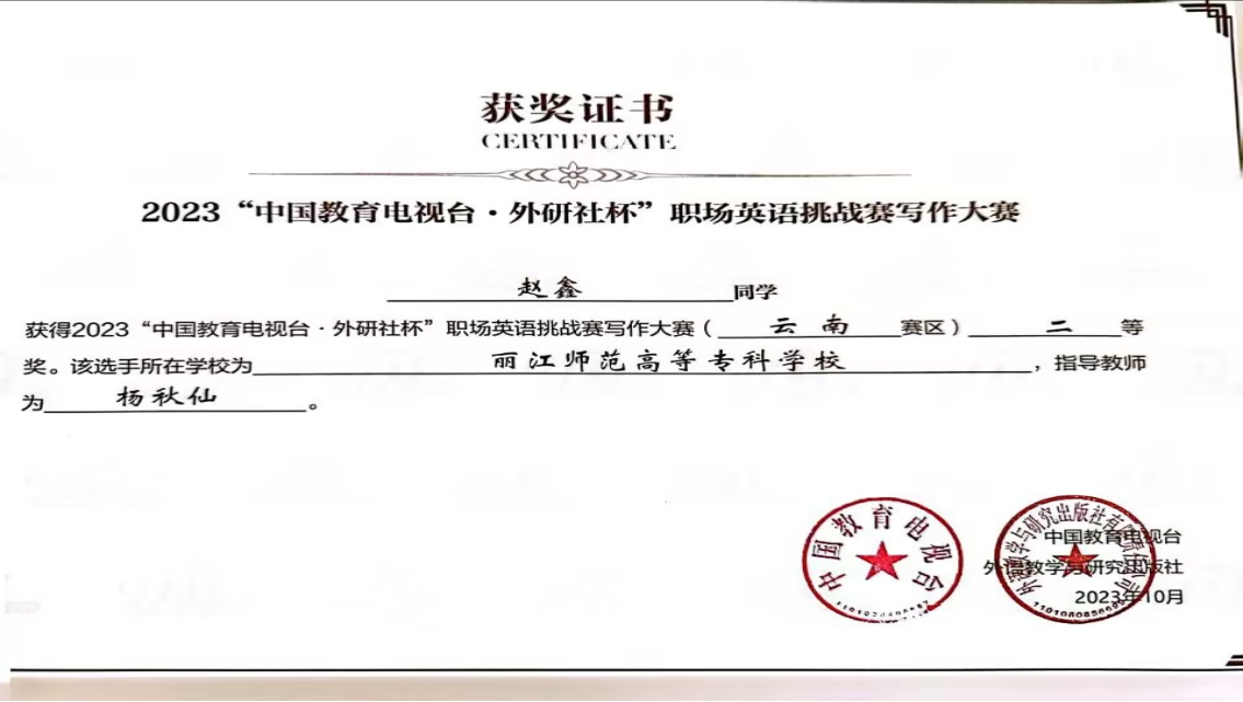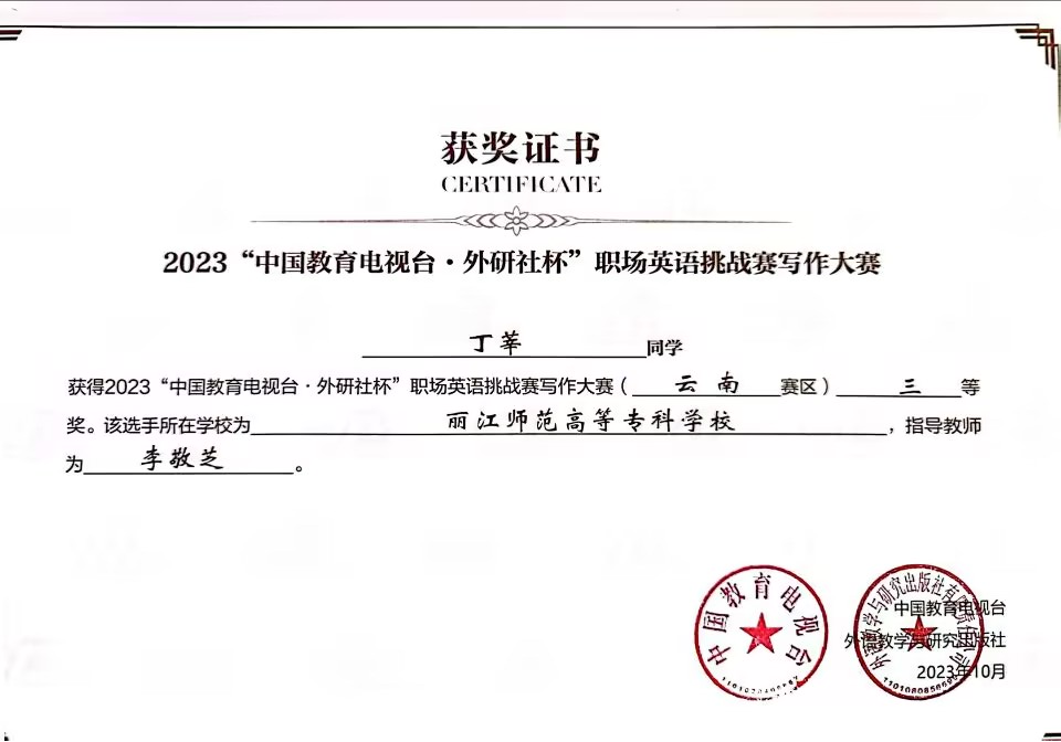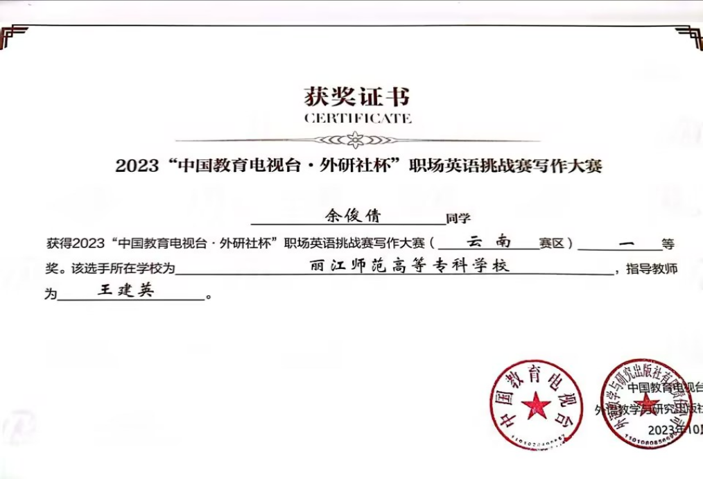 外国语学院在2023“中国教育电视台外研社杯职场英语挑战赛写作大赛中荣获佳绩:一等奖 余俊倩,指导教师为王建英;二等奖 赵鑫,指导教师为杨秋仙;三等奖 丁莘,指导教师为李敬芝。